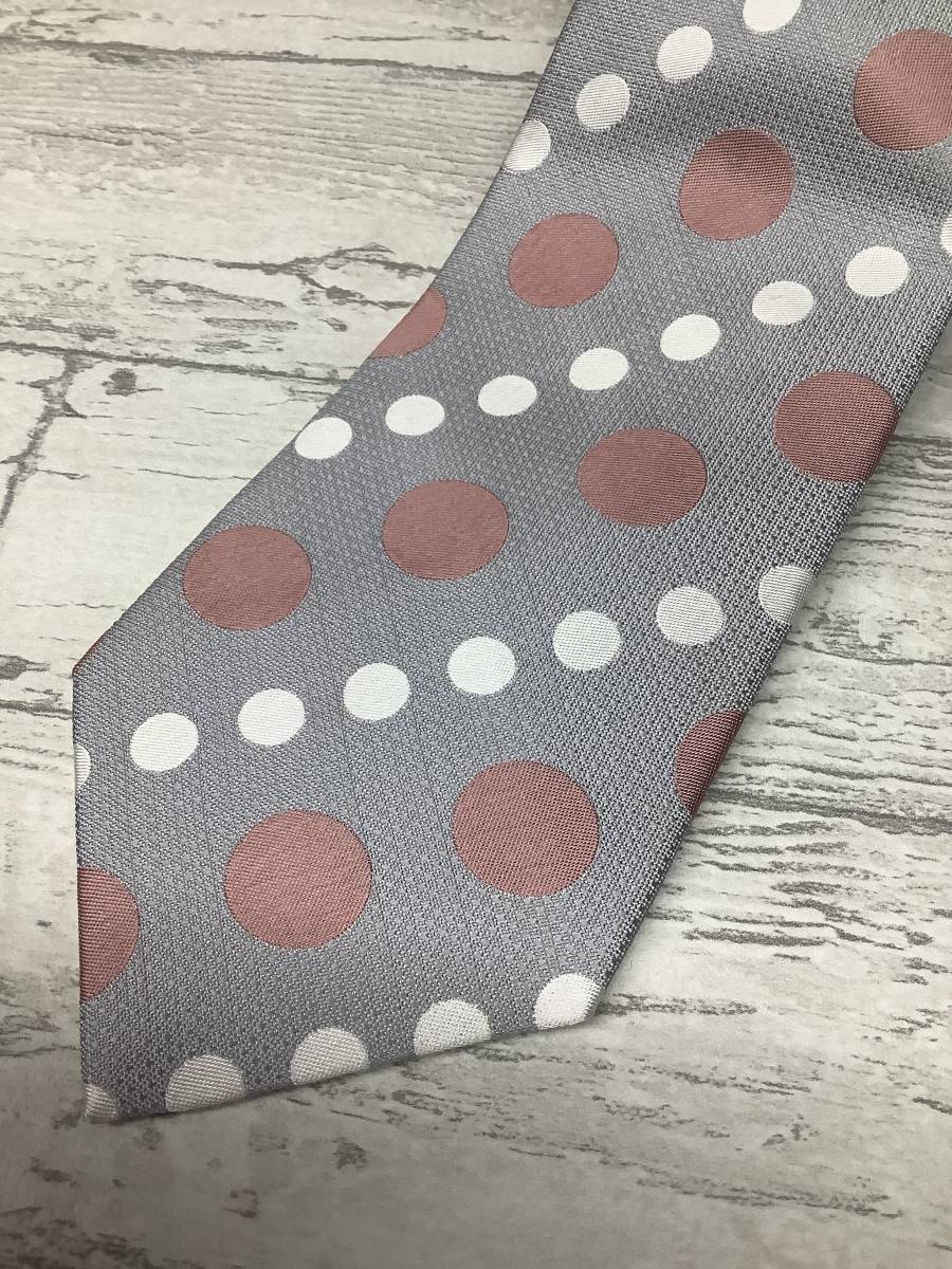 新品タグ付き 定価6,800 京都織物使用のノーブランドネクタイ 極上のかわいい水玉柄 明るいシルバー ピンク白玉