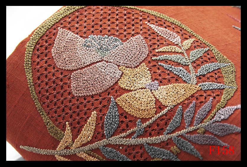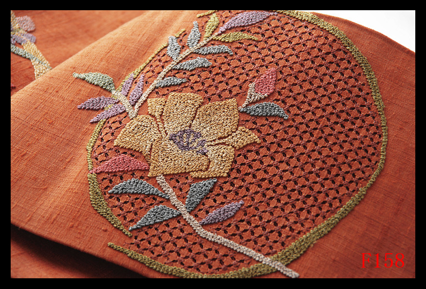 【F158】厳選西陣 紬 スワトウ刺繍 相良刺繍 草花の丸文様黄櫨染色地 高級美術名古屋帯 ◇検◇簪着物名古屋帯帯締め
