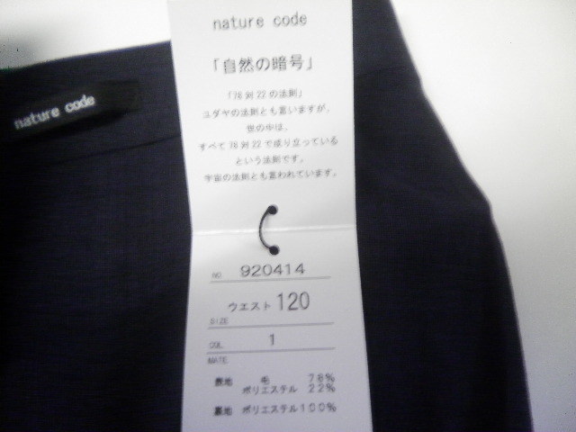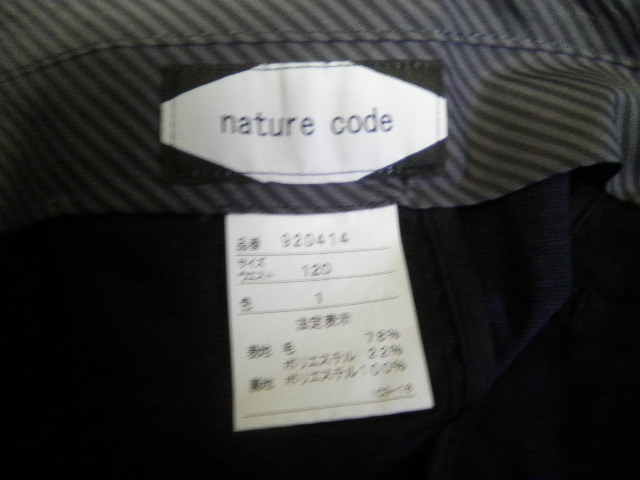 商品 情報 | 新品 下げ札付き☆です!!(モニター環境により色が写真と少し異なる場合があります) ☆カラー 濃紺系 (写真参照) オールシーズン対応 ☆表記サイズ ウエスト 120cm 仕様 外側ポケット数×4つ / ジップフライ / ノータック ☆平置きサイズ(㎝)ウエスト 120/ヒップ 130 /股上 30 /股下 92 /渡り幅 39 /裾幅 21 ※参考程度に(測る場所により多少の誤差が生じます) ☆素材 [表地]毛78% ポリエステル22% [裏地]ポリエステル100% made in vietnam ☆裾は未処理になっております ☆裾上げの対応はお受けしておりませんんで、ご理解の上、入札をお願い致します ☆ブランド Nature Code ネイチャーコード ☆処分品に付き保管上の折りたたみシワ、多少のほつれ、汚れ傷み等がある場合もあります、ご理解の上、入札をお願い致します |