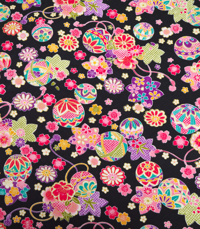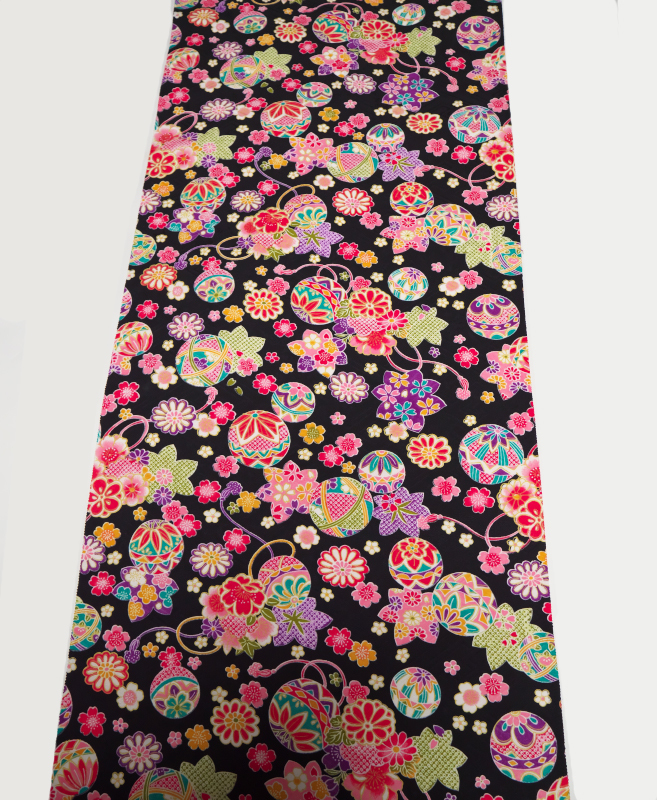 268-a番 新品 正絹 小紋 縮緬地端切れ【ハギレ、はぎれ】39.5センチ×135センチ 大き目の紗綾型の地模様に黒にカラフルな手毬や花の模様