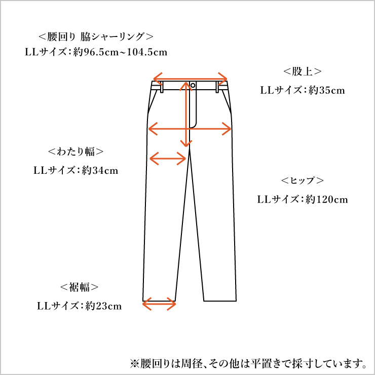 ●実寸サイズ/腰廻り96,5cm~104,5cm、股上35cm、股下68cm、ヒップ120cm、わたり幅34cm、裾幅23cm