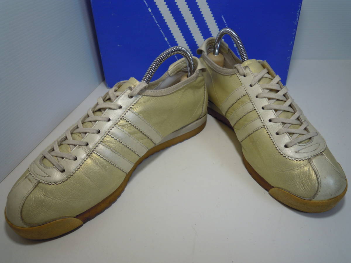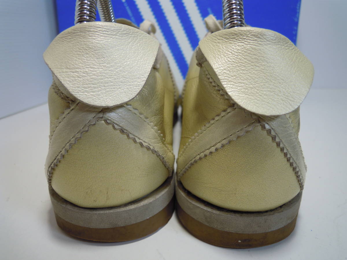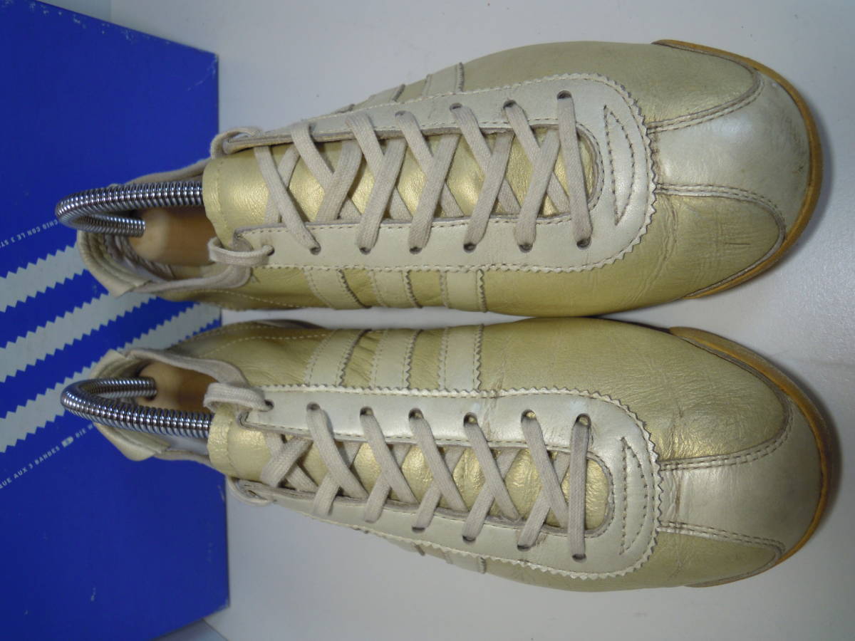 【ブランド・形態】 adidas ITALIA Ⅱ W SHW675 カンガルー皮スニーカー サイズ23.5cmです。 【カラー】 ライトゴールド、クリーム色です。 掲載の実物写真はPC環境や光の加減により実物と色合いが若干異なる場合があります。 【特徴】 インソールにはブランドロゴなどのプリントは無く無地となっています。 キメの細かいソフトなカンガルーレザーを使用している為、カンガルーレザー特有の細かいシワが購入時からついています。 今は手に入りにくい希少なモデルです。 ヒール高:2.0cm、最大幅:8.5cm 【状態】 少々使用感はございますが、特に目立つダメージは見受けられず、使用に問題無いと思われます。 アッパーは細かなシワはありますが比較的にきれいです。かかと・つま先は少しすり減りがあります。 保存箱はあります。 【素材】 アッパー:本皮革(カンガルー皮) アウトソール:合成底 【サイズ 】 23.5cm 質量:550g+箱170g | |||