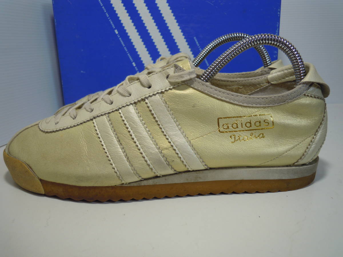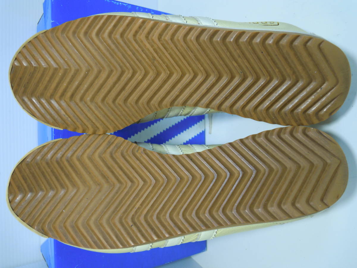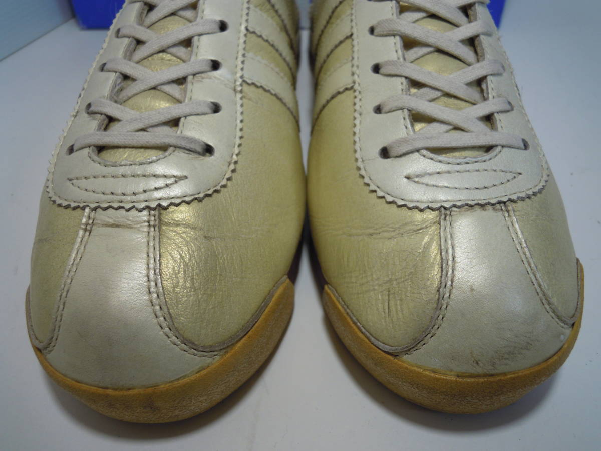 【ブランド・形態】 adidas ITALIA Ⅱ W SHW675 カンガルー皮スニーカー サイズ23.5cmです。 【カラー】 ライトゴールド、クリーム色です。 掲載の実物写真はPC環境や光の加減により実物と色合いが若干異なる場合があります。 【特徴】 インソールにはブランドロゴなどのプリントは無く無地となっています。 キメの細かいソフトなカンガルーレザーを使用している為、カンガルーレザー特有の細かいシワが購入時からついています。 今は手に入りにくい希少なモデルです。 ヒール高:2.0cm、最大幅:8.5cm 【状態】 少々使用感はございますが、特に目立つダメージは見受けられず、使用に問題無いと思われます。 アッパーは細かなシワはありますが比較的にきれいです。かかと・つま先は少しすり減りがあります。 保存箱はあります。 【素材】 アッパー:本皮革(カンガルー皮) アウトソール:合成底 【サイズ 】 23.5cm 質量:550g+箱170g | |||