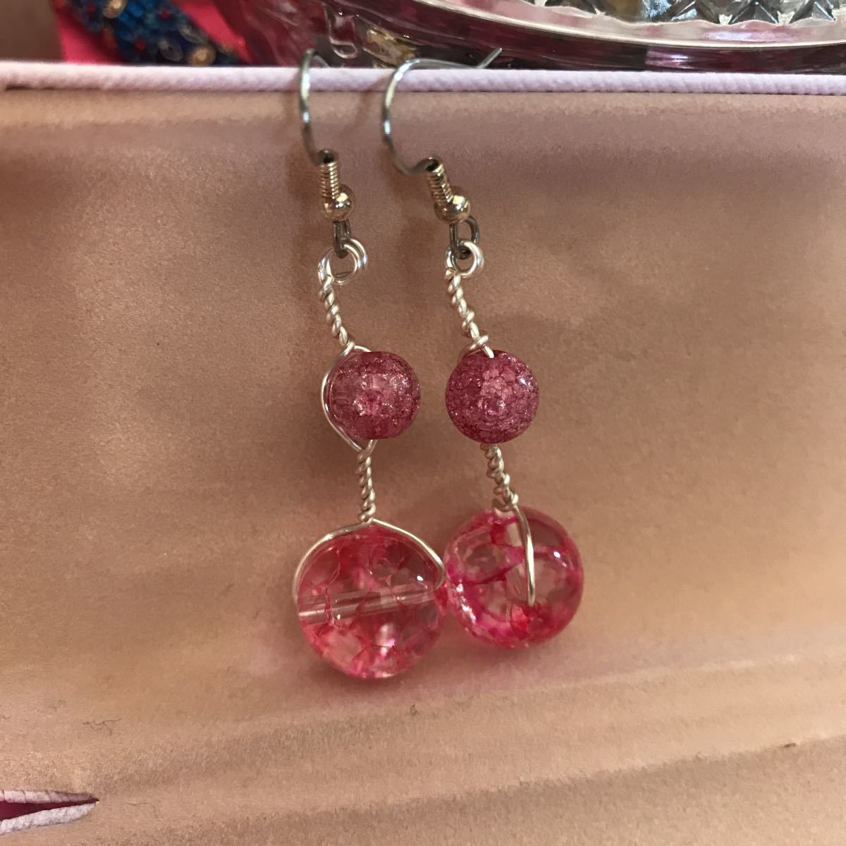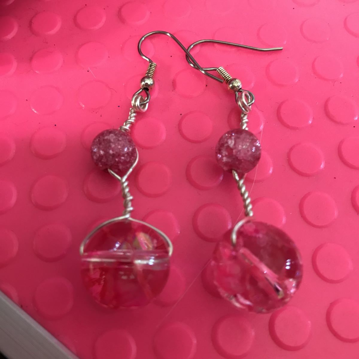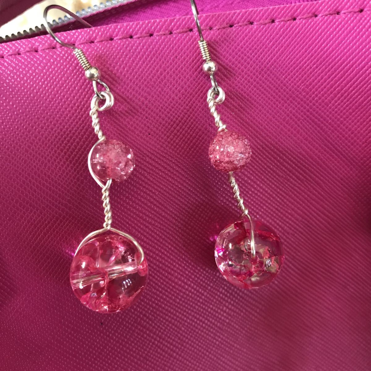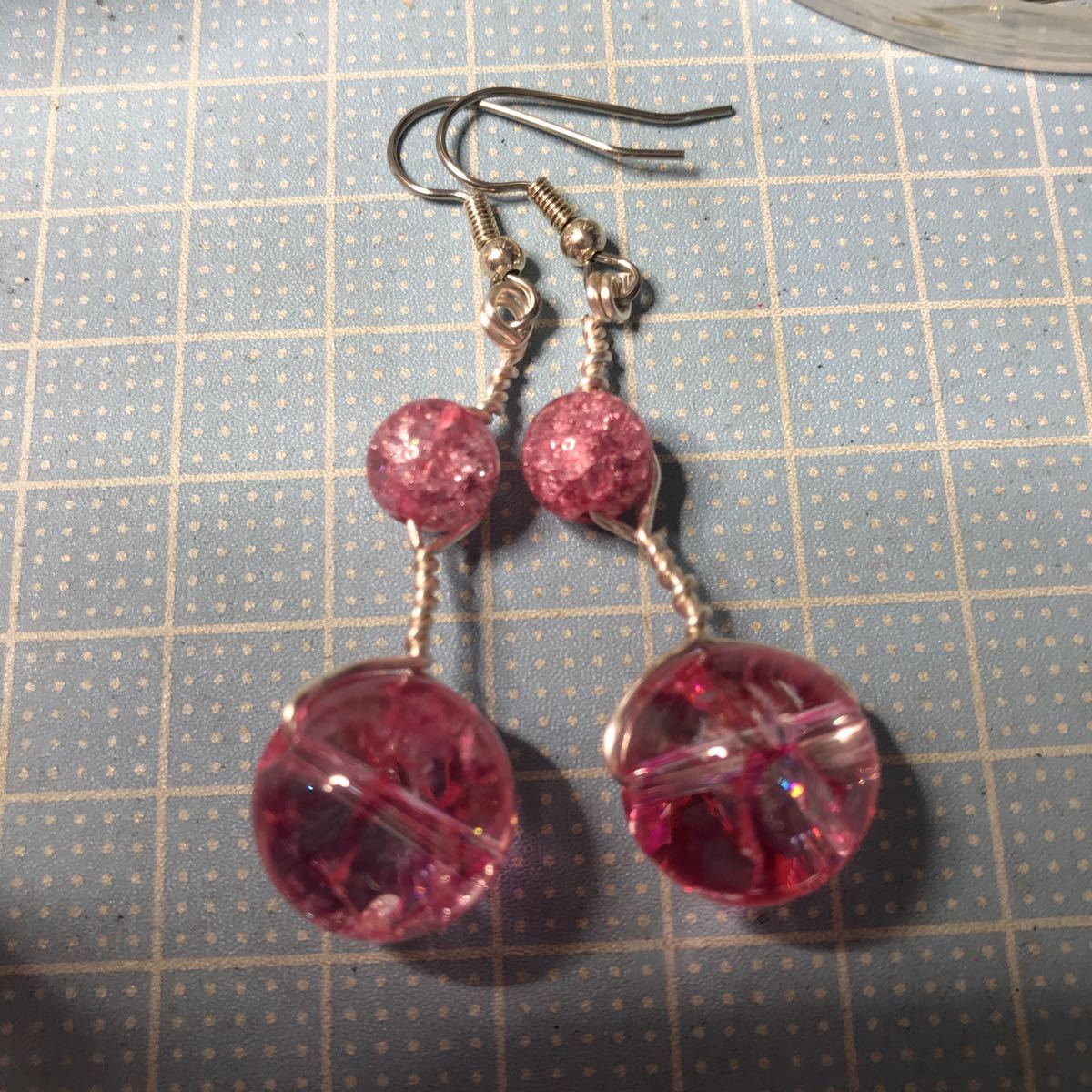 14ミリと8みりのクラック水晶使用しております、ワイヤーに通しとても可愛い仕上がりになりました。フックはサージカルステンレス使用しております。
