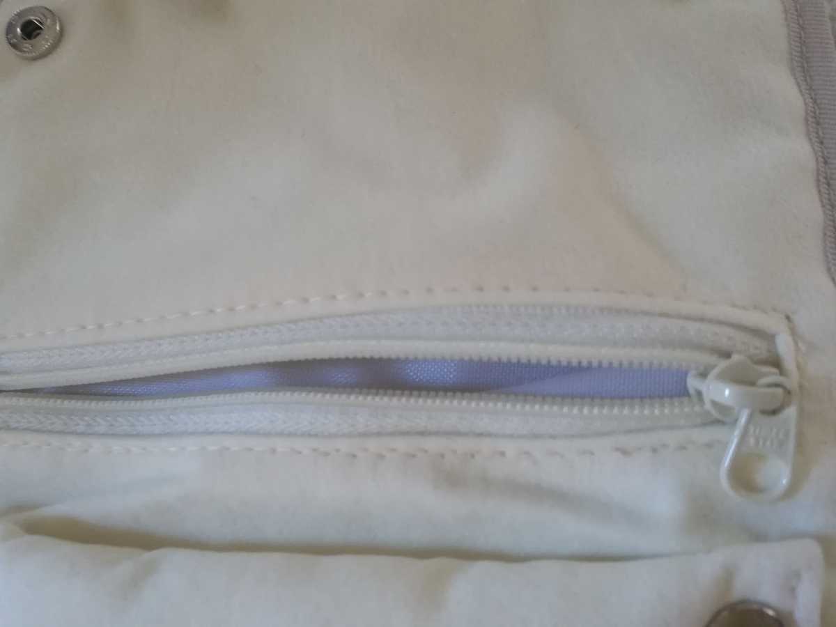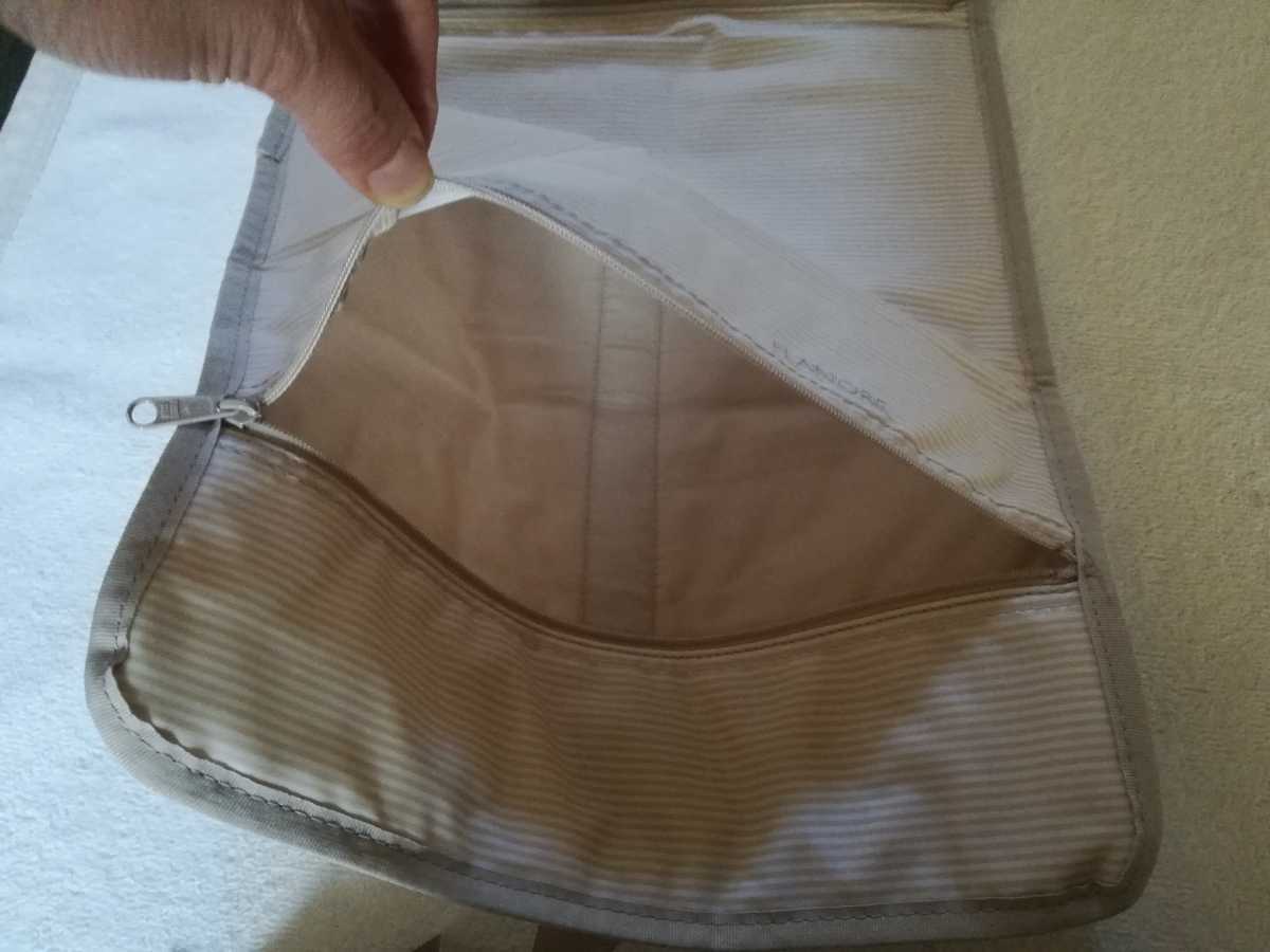 素材は外側はベージュとホワイトの細かいストライプの艶消しコーティング生地でちょっとした汚れには対応できます。