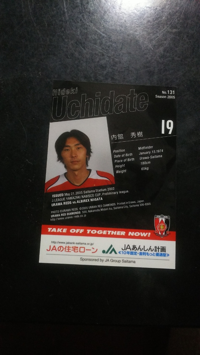 2005年の浦和レッズのマッチデーカードの内舘秀樹選手になります。カードスリーブと硬質のカードケースに入れて発送いたします。新品になりますのでノークレーム、ノーリターン、ノーキャンセルでお願いします。