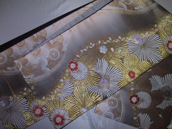 なお、帯柄左上に無地で出ているところは裏無地で、柄と柄の間に出ているところは手先と前太鼓のあいだの無地部分です。六通柄です。金銀糸が多用されているためストロボの照りで、しろぽく写っている部分があります