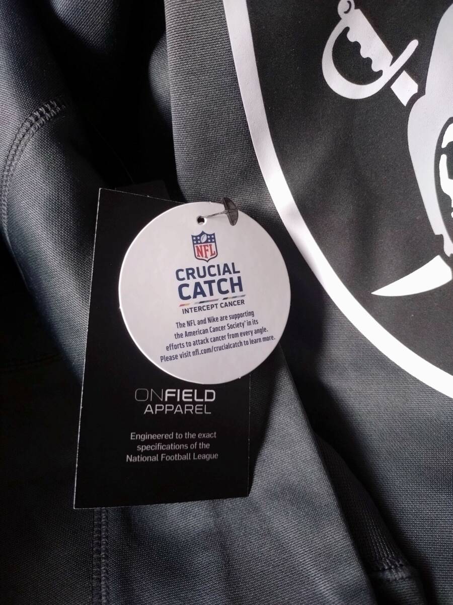 レイダースのパーカーです。選手やコーチたちがサイドラインで着用しているのと同モデルのパーカーです。ナイキ社製、サイズ:M(身幅約56cm、着丈約70cm)、新品未使用、タグ付きです。がん撲滅キャンペーンの”CRUCIAL CATCH”のパッチが左胸に刺繍されています。軽量ですが、防寒性も非常にあります。