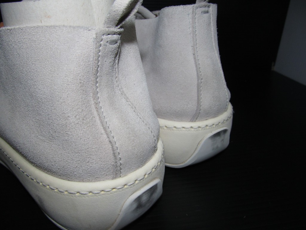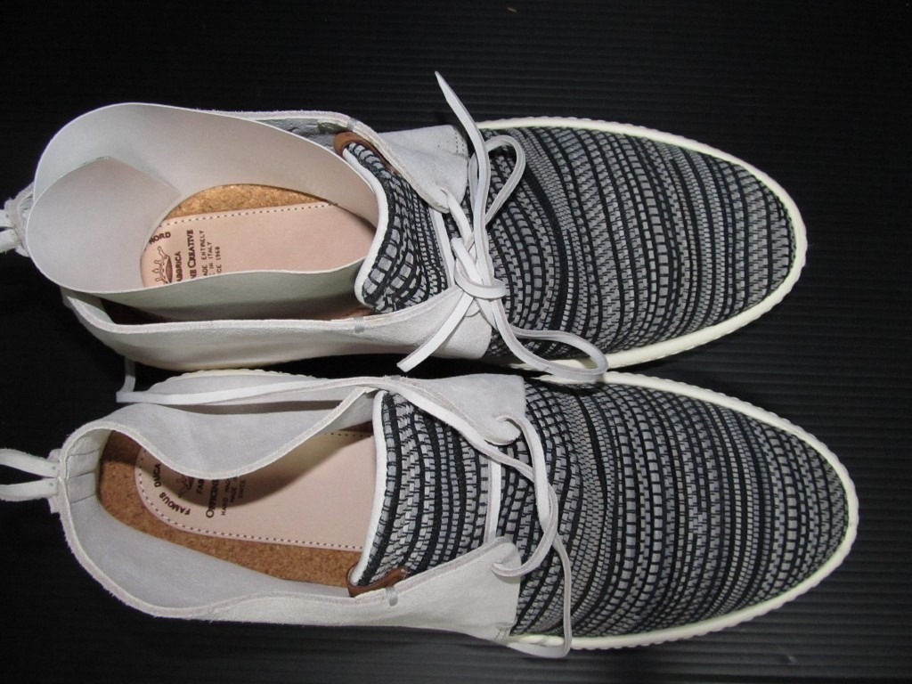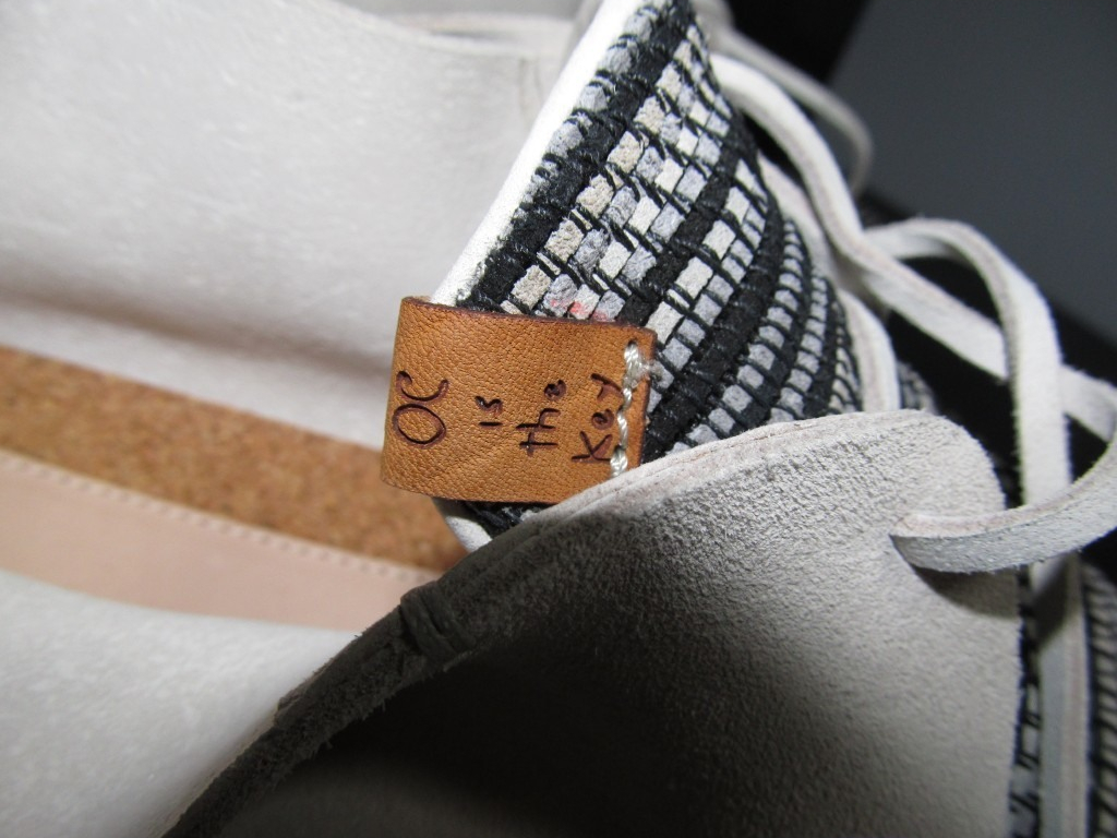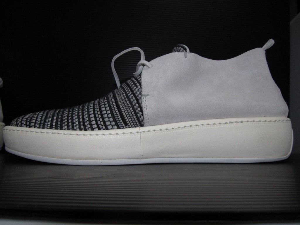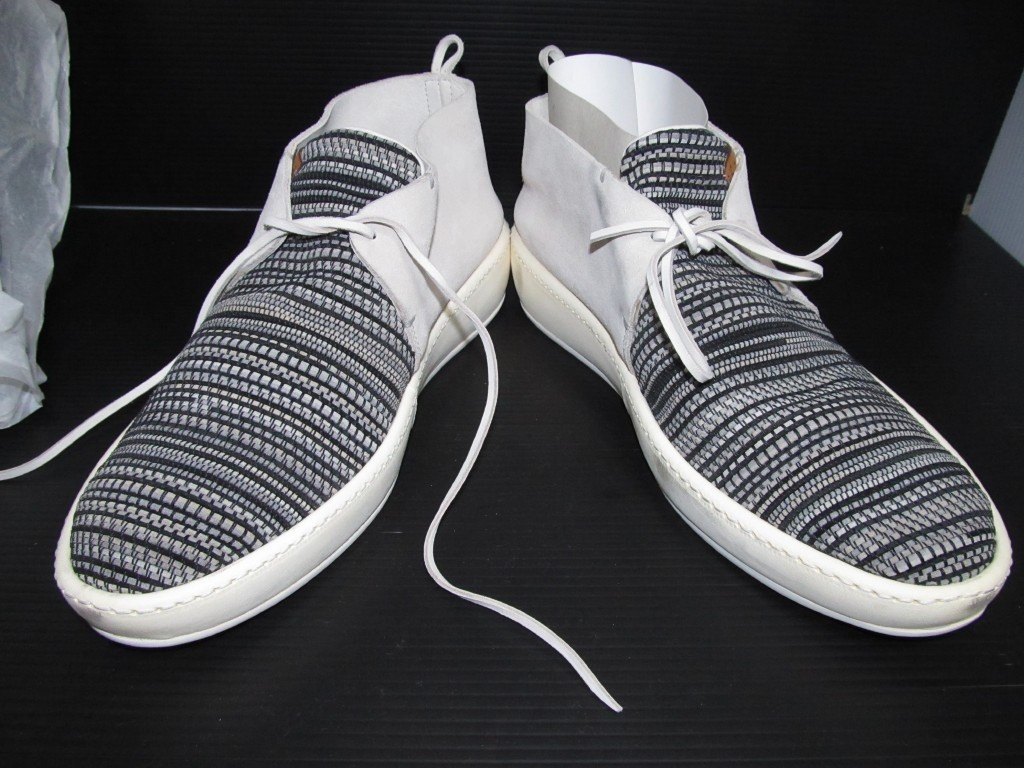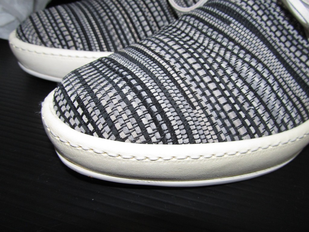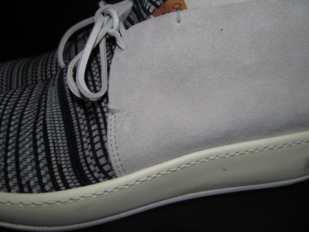 本品はモデル名「PANNA」、ライトグレーとネイビーのスエードレザーを用いたシューズです。特徴的なのが甲部分で、非常に細い革を何本も縫い合わせて造られており、他のシューズでは見られない独特なストライプ柄を構成しています。