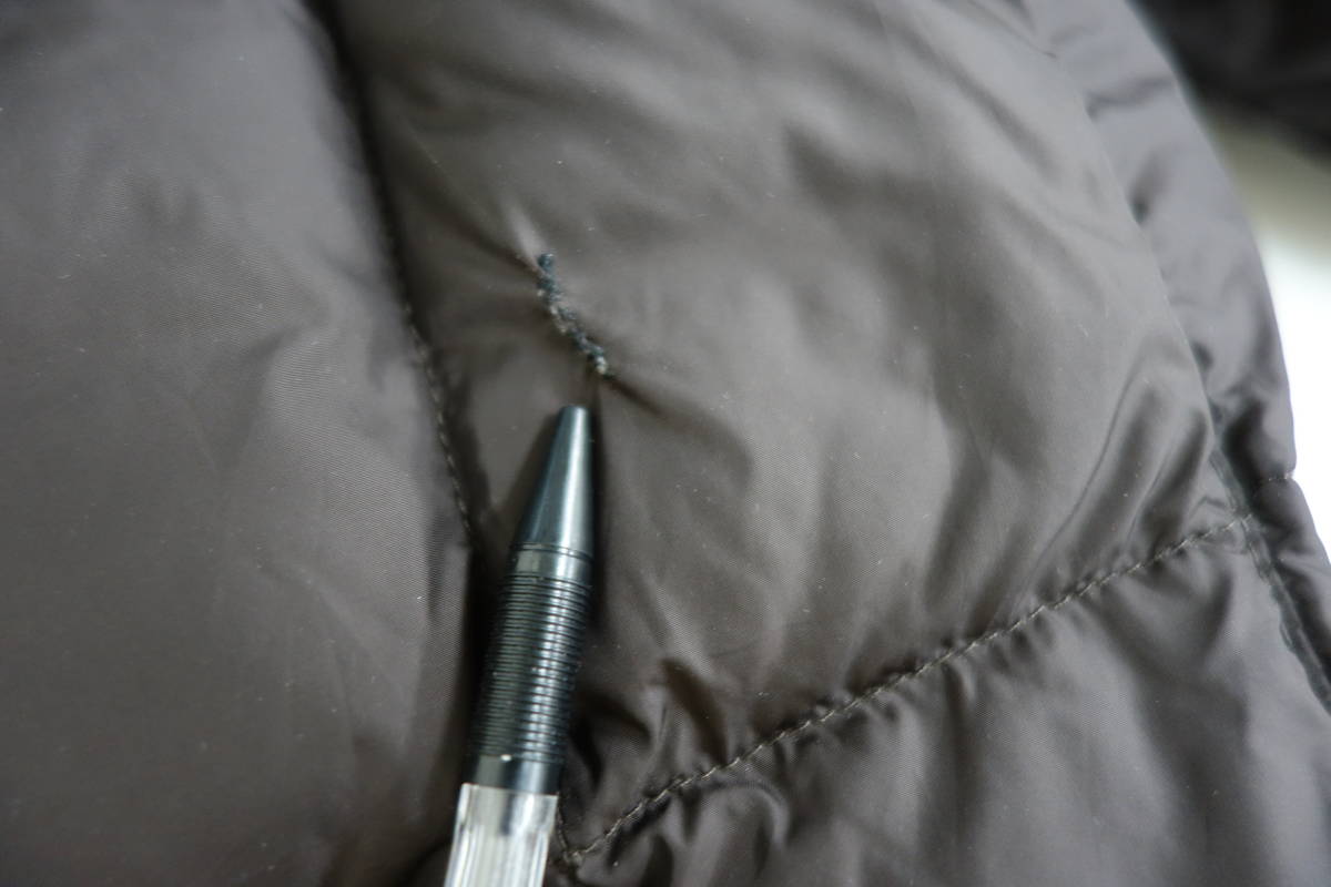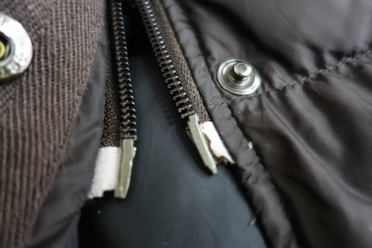 フード欠品してます。ジップ差し込み部分のテープ剥がれありますが開閉は問題なくできます。フロント右ポケット付近に小さい色抜けのような箇所あり、後ろ右脇付近にリペア跡あります。画像参照ください。
