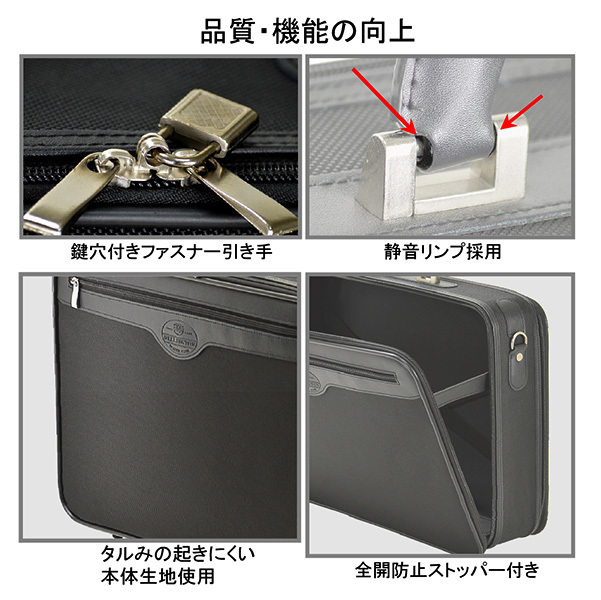 | 商品説明 | ◆軽くて丈夫なソフトアタッシュケース。 ポケット収納が充実した使いやすいビジネスギアです。 ◆ハニカムフレームを採用し丈夫さと軽さを両立。 ◆ソフトアタッシュケースならではのポケット収納や オーガナイザー機能など、ビジネスに欲しい機能を満載。 ◆ショルダーベルト付きの2WAY仕様。 両手が空くのでスマホ操作なども楽にできます。 【 商品詳細 】 サイズ横幅48×高さ35×厚み14(cm) 素材1680Dポリエステル 裏PVCコーティング カラー01-黒 重量約1,950g(ショルダーベルト含まず) 本体正面ファスナーポケット、ファスナーアウトポケット メインルーム 内部吊りホック留めポケット、固定ベルト、全開防止ベルト A3ファイル収納可能 正面アウト ポケット内部マチ付きポケット、ペン差し、2分割ポケット、2分割ネットポケット サブルーム内部吊りホック留めポケット、蛇腹仕切り その他肩アテ付きショルダーベルト、底鋲付き 生産地中国(企画:日本) 現在お試し大特価、送料無料、値引き中でお買い得となっています。 ※ 予告なく仕様変更する事がありますのでご了承下さい。 |