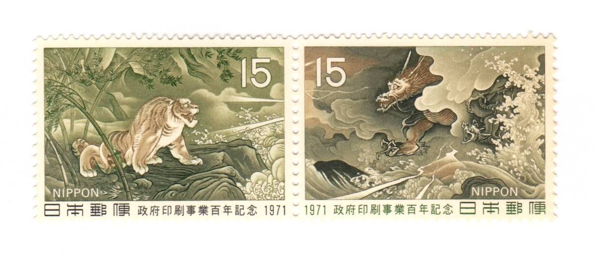 昭和46年1971「政府印刷事業100年記念/橋本雅邦画『竜虎図』虎~竜【連刷 対面連続組】」15円切手2種 未使用 送料無料 熊五郎の切手 800418