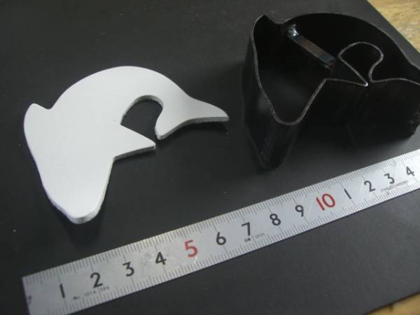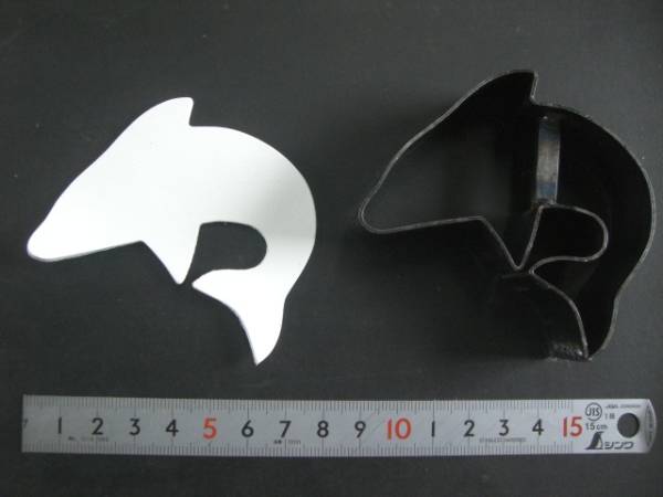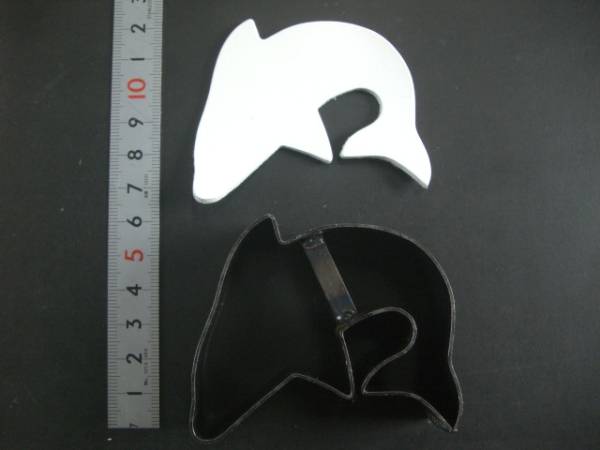 裁断用抜型 イルカ サイズは幅が約75mm、高さが約75mmです。刃型の高さは23.6mmです。商品は、画像の抜型のみです。試し抜きで約3㎜の革を抜いてみました。紙や生地なども裁断可能です。