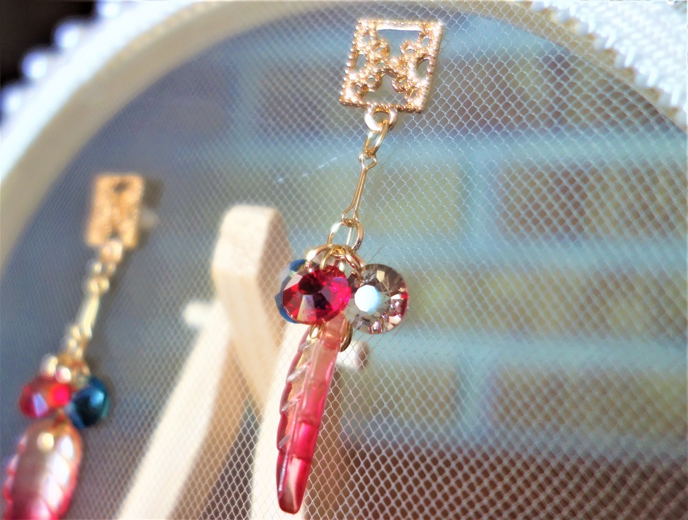 【リーフ&グラデーションビーズのピアス/透かし台座】送料無料/ハンドメイドアクセサリー