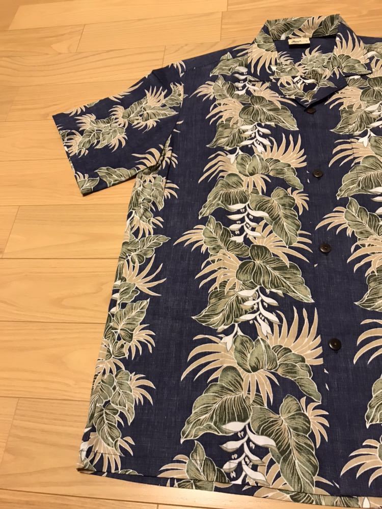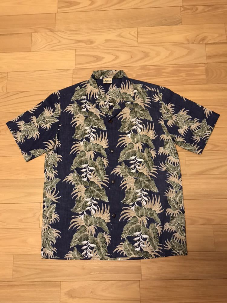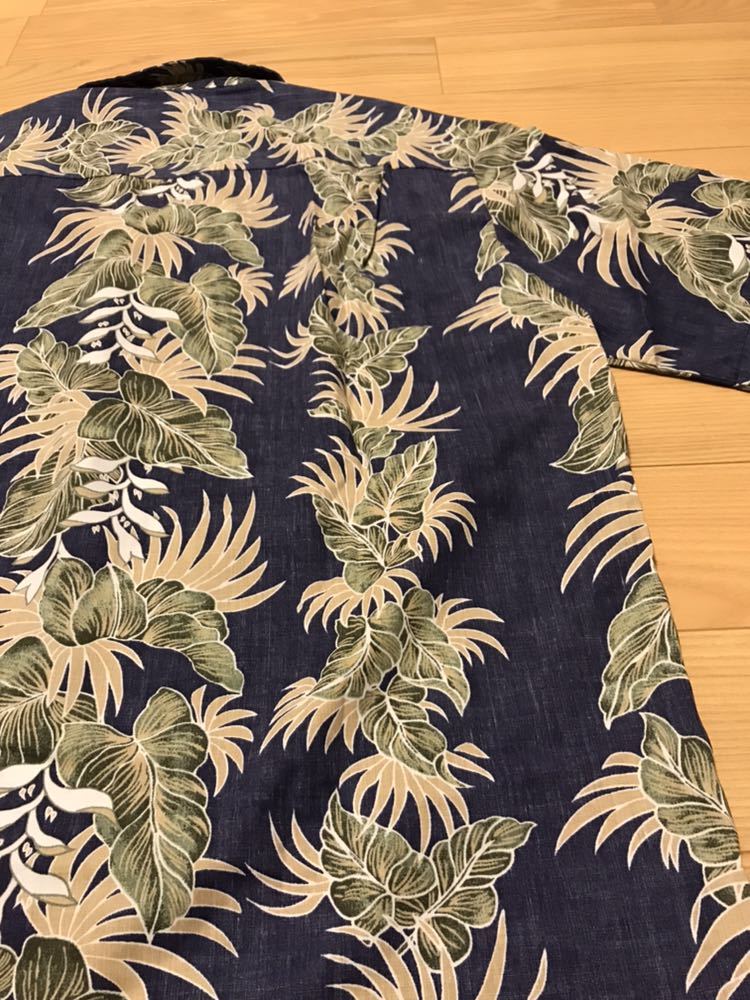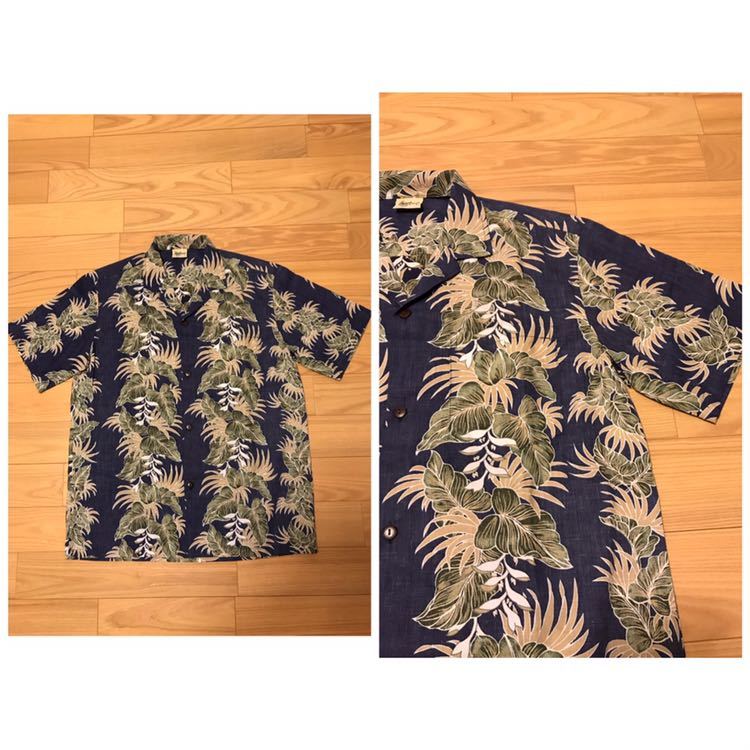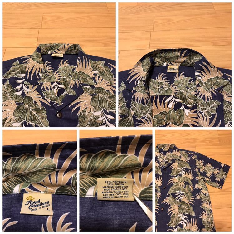 着用極少な目.極美品☆Hawaii.USA製 ROYAL CREATIONS サイズL大き目 ナス紺色 裏使い生地 リーフボーダー柄 リバースプリント アロハシャツ