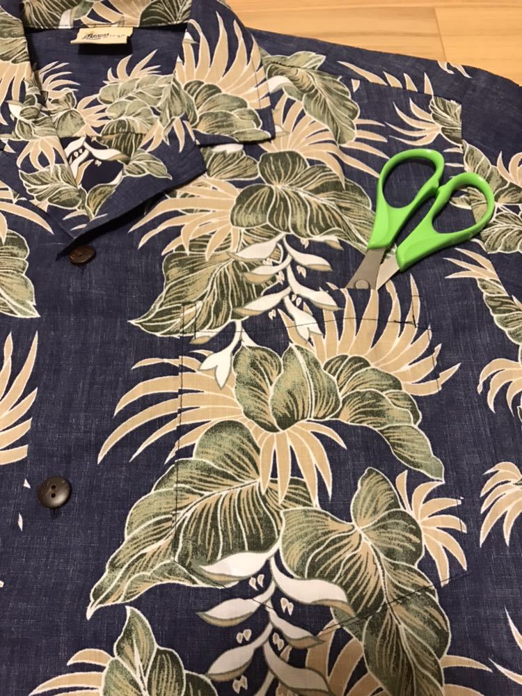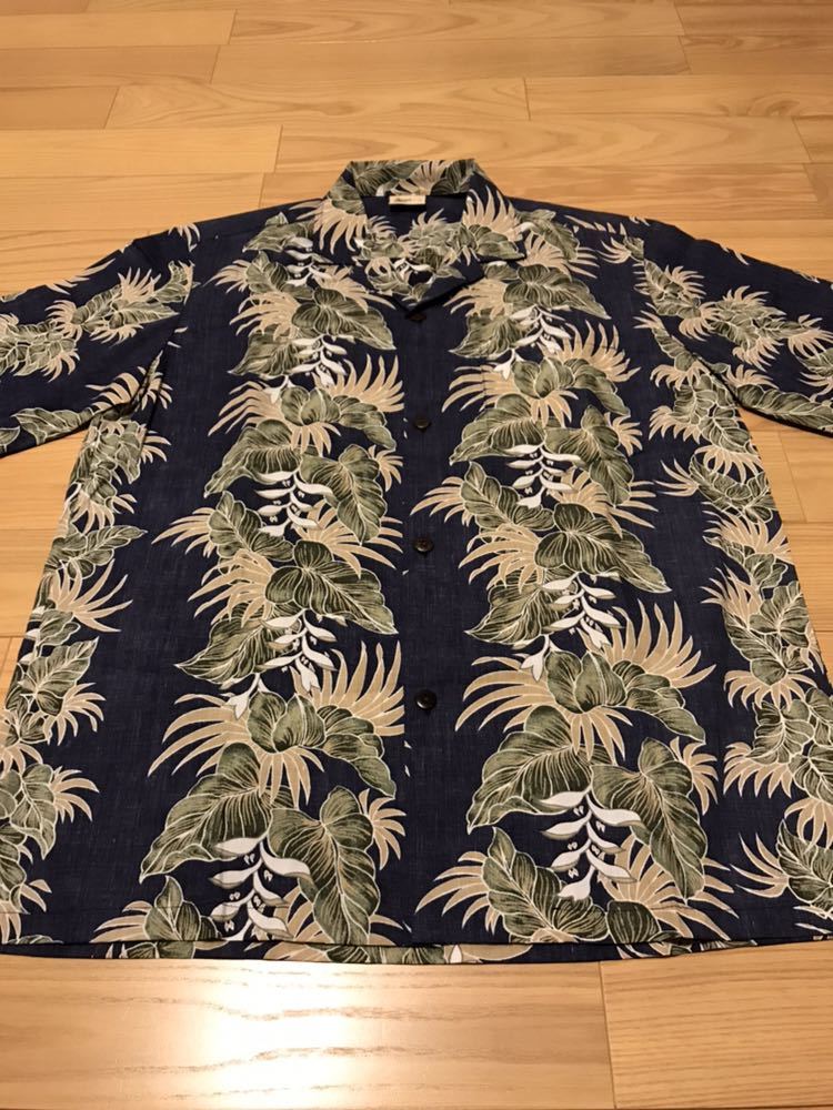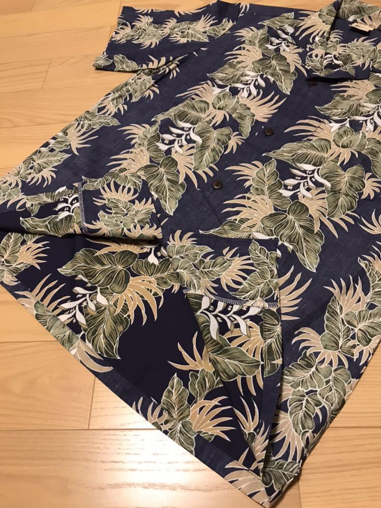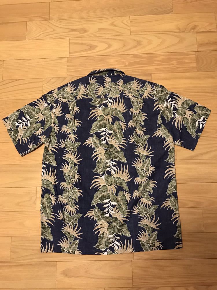着用極少な目.極美品☆Hawaii.USA製 ROYAL CREATIONS サイズL大き目 ナス紺色 裏使い生地 リーフボーダー柄 リバースプリント アロハシャツ