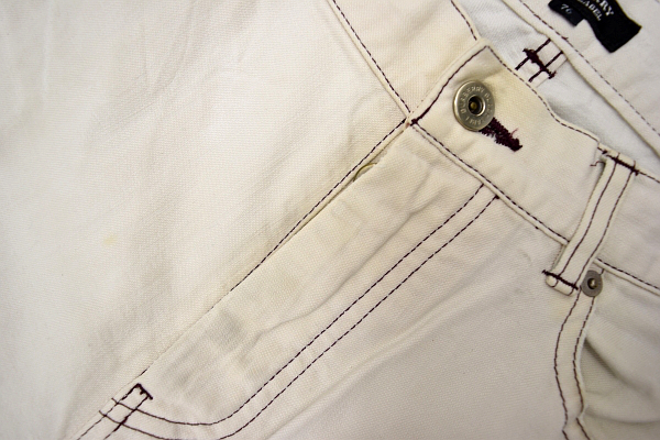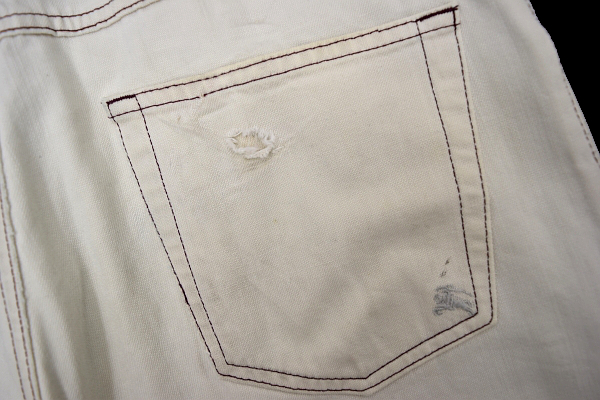 右ヒップポケット、フロントポケットや両裾などに使用に伴うダメージ(コスレ、破れ)がみられます。