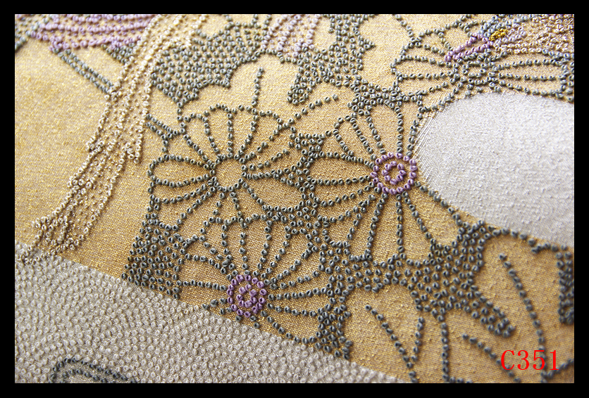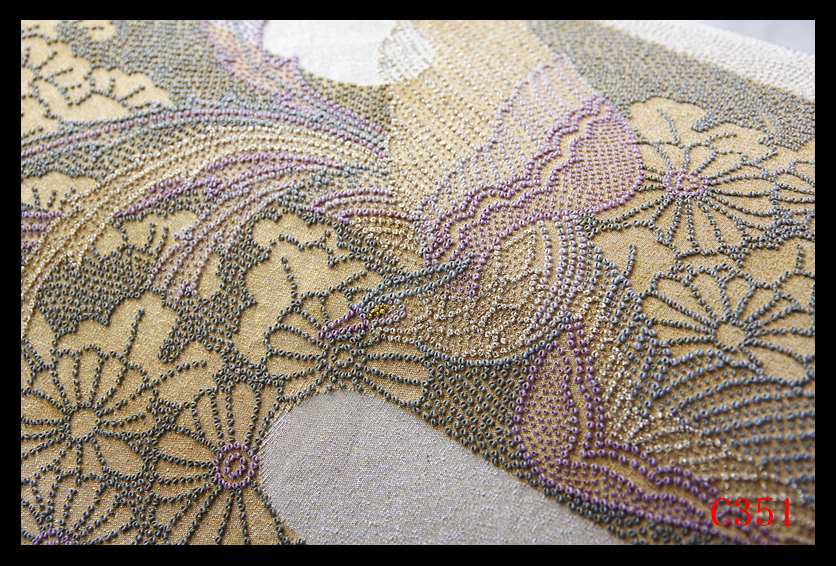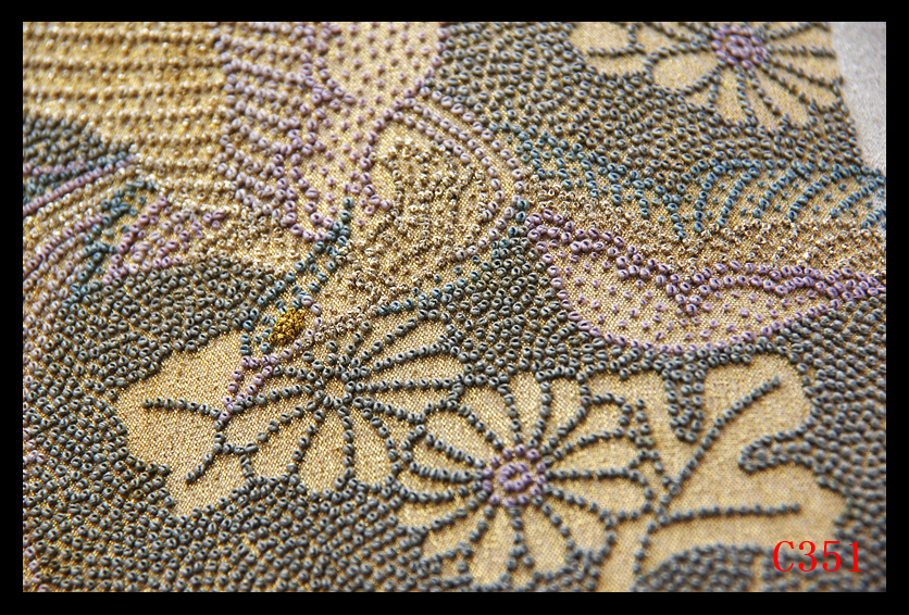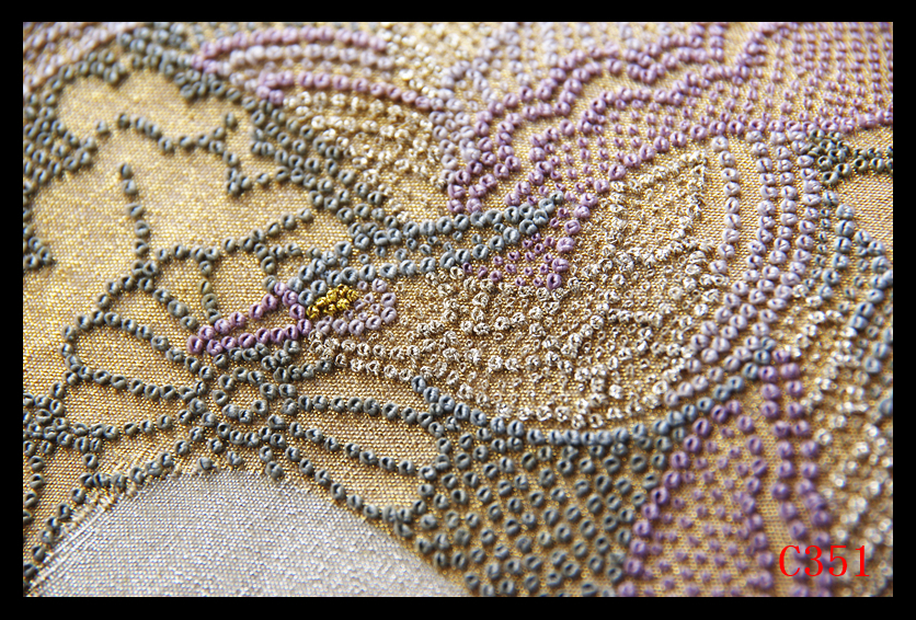 点を連続させて線を表し、間隔を空けて面を表し、面内を繍い詰めるなどの表現方法は立体感の中にも豪華さがあります。