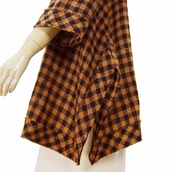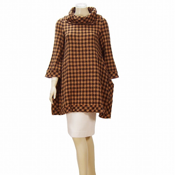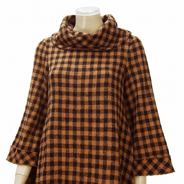 **・゜ふんわり柔らか素材の可愛い変形ワイドスモックチュニックです。極々僅かな透け感のあるふんわりネップ入りのウール混織生地を使用(濃茶系×オレンジブラウン系の2色チェック織地)2枚重ね生地使いの(輪リング)立体ハイネック×切りっぱなし風の袖口&裾は2枚重ねと生地の向きを変えたトリムデザイン×たっぷりワイドなシルエット×袖は幅広&ほんのりベル風7分袖×両サイド変形スリット入り!!スモック仕立ての可愛いオーバーサイズの変形チュニックワンピースです。。.。*:.。(春秋、初秋向き)
