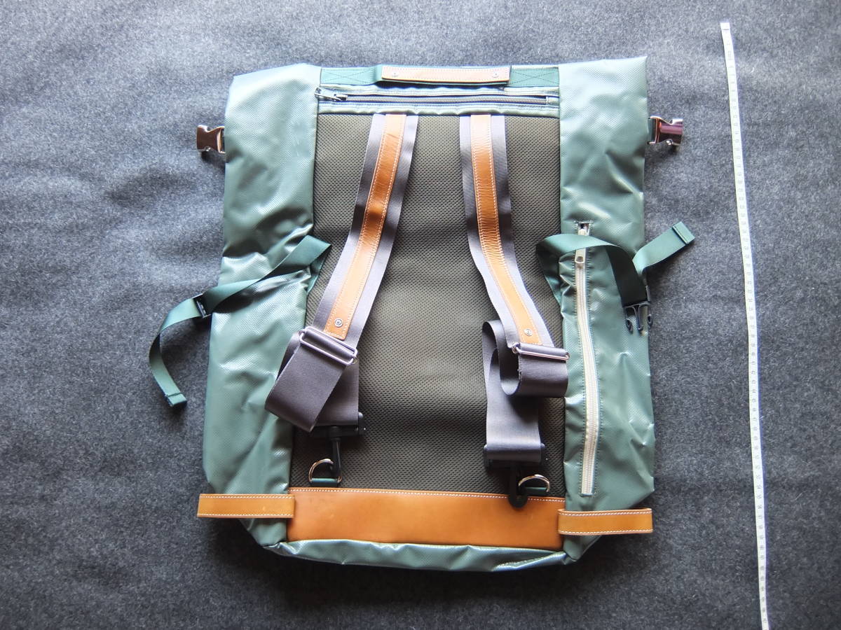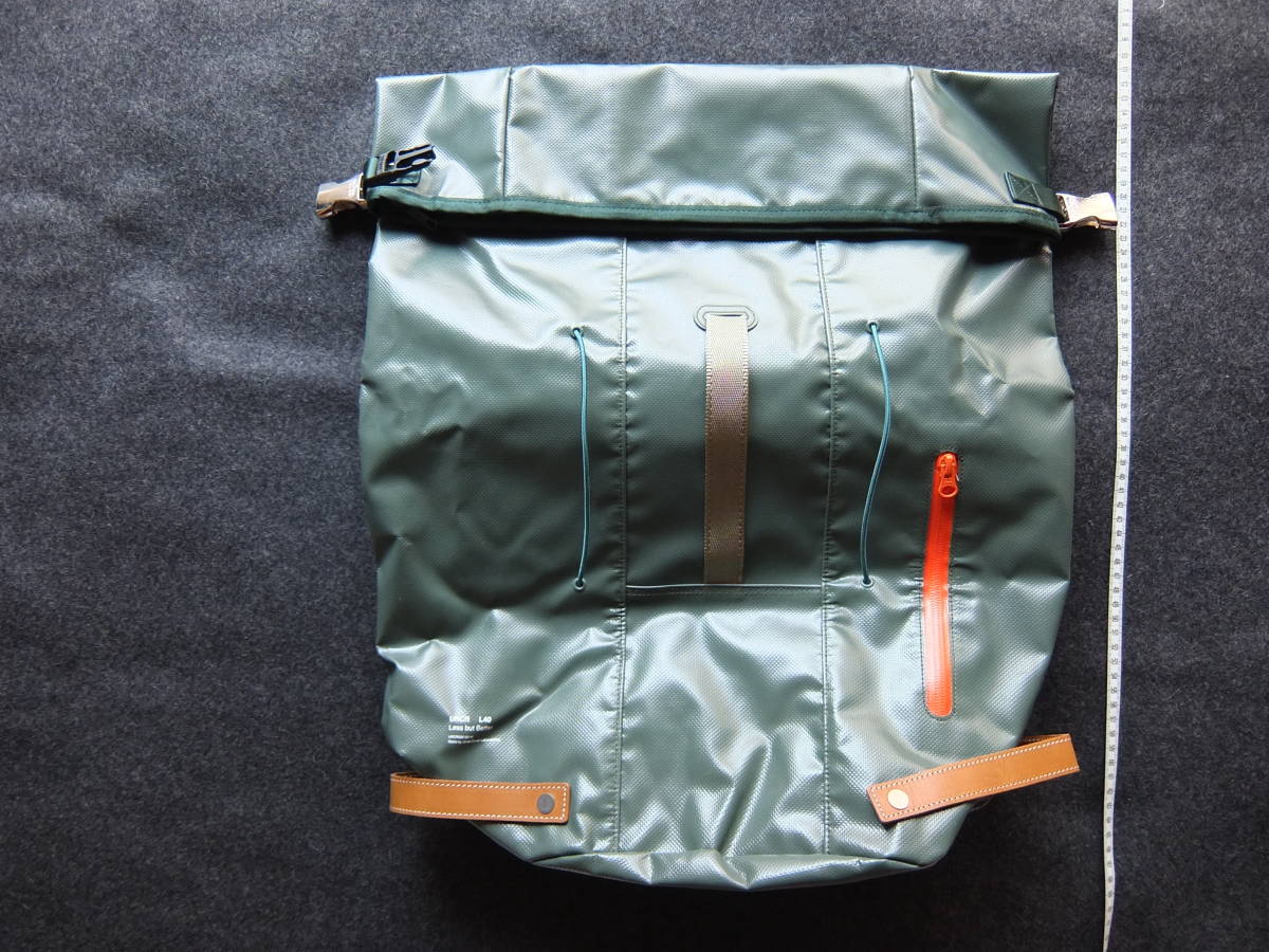 ①バックパック サイズ 縦 66cm(伸ばした状態の最大)×横 48cm(平置き)底33cm ×マチ 21cm