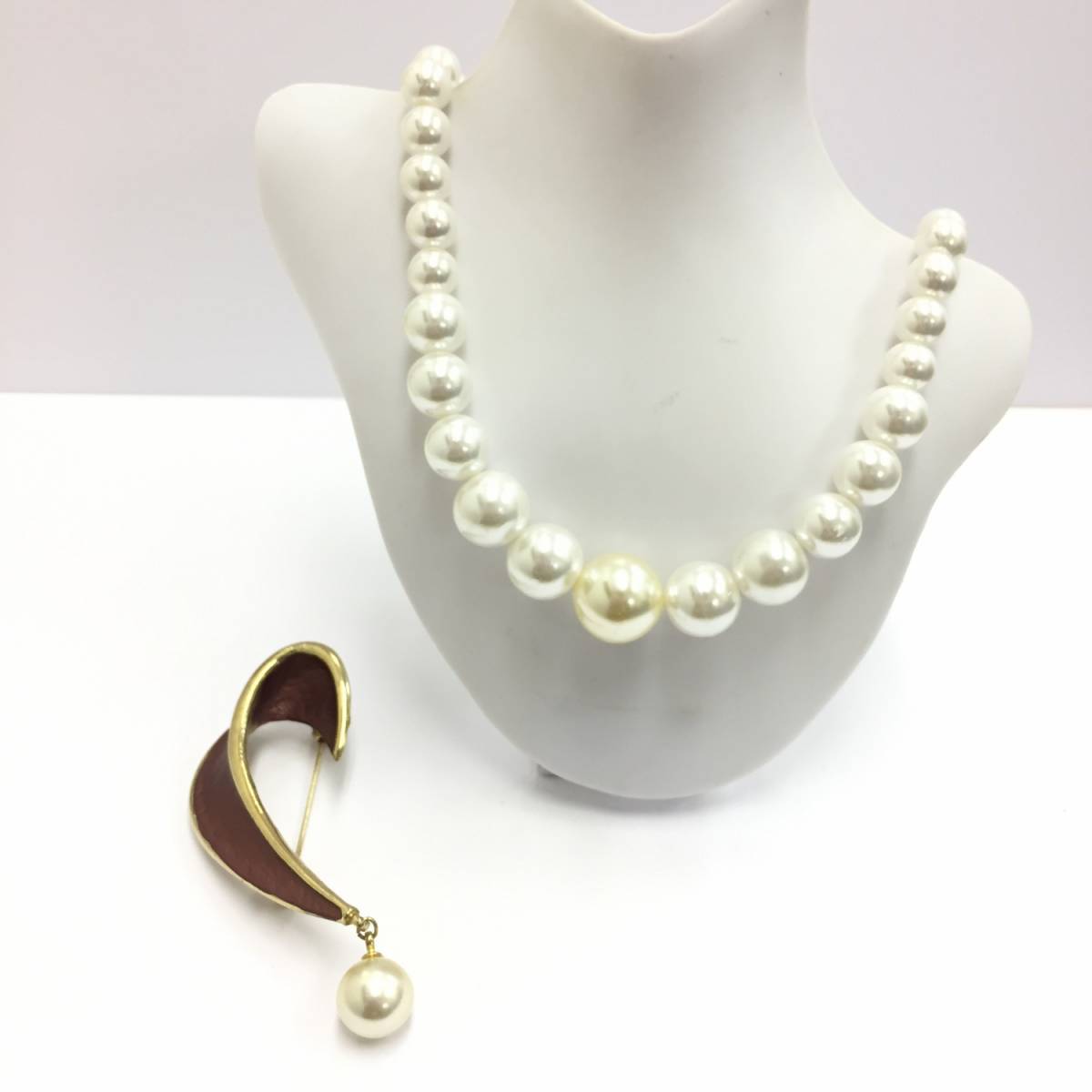 【ネックレス ブローチ】セット パール(約6~15mm/約12mm) 一連 冠婚葬祭 ホワイト 白 レトロモダン エレガント 上品 アクセサリー