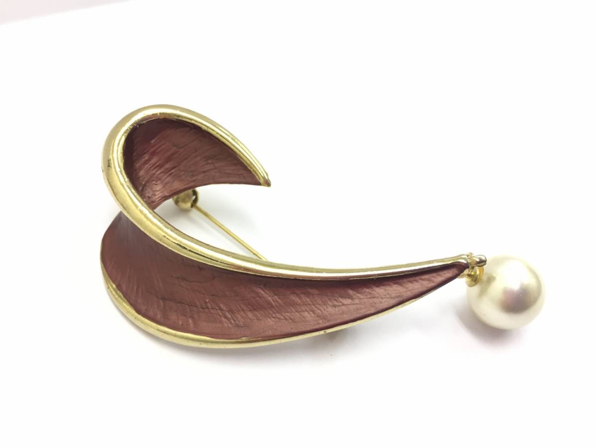 ブローチは流線的なスタイリッシュデザインで、光沢あるブラウンとゴールドの色合いが上品です。パールが1粒アクセントで付いており、ゆらゆらと揺れます。