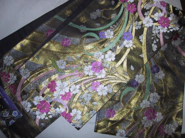 京都西陣 じゅらく の 若向きよう(振袖、訪問着、付け下げ、無地、小紋、など向き)のTOPブランド品『花かるた(花かおり)』ブランドです。6通柄袋帯 新品未仕立て品、絹100%金属糸等使用   墨色に金色のの生地に 花リボン、、、