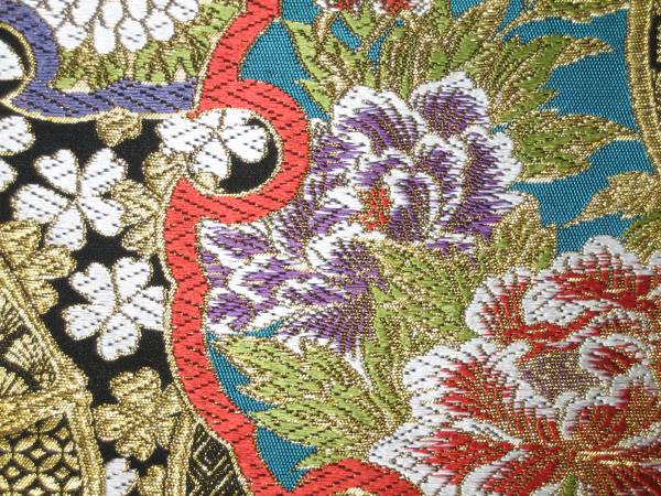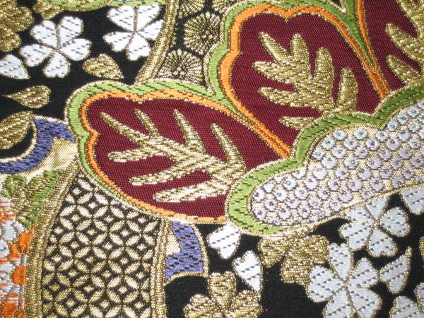なお、帯柄左上に無地で出ているところは裏無地で、柄と柄の間に出ているところは手先と前太鼓のあいだの無地部分です。六通柄です。金銀糸が多用されているためストロボの照りで、しろぽく写っている部分があります
