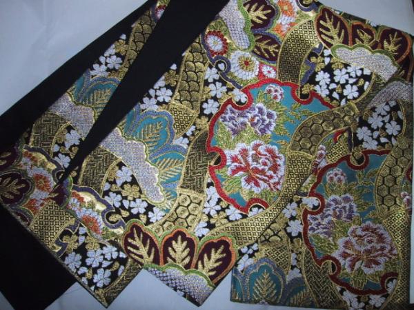 くろ色 (裏地くろ)かいきり(たれ先柄立ち上がり)~かいきり(手先柄はし)まで約449,5cmですので、出来上がり予想は約446cmです。巾31,0cm 御園自己証紙