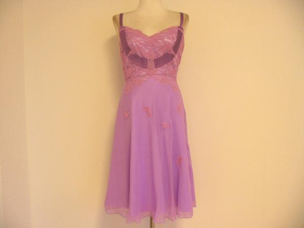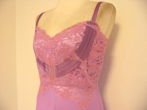 全体は柔らかで、透け感のあるシルクシフォン。ラベンダー色です。 トップフロントはゴージャスにピンク色のお花のレース。 裏地はラベンダー色の光沢サテン生地で、表に透け見えます。