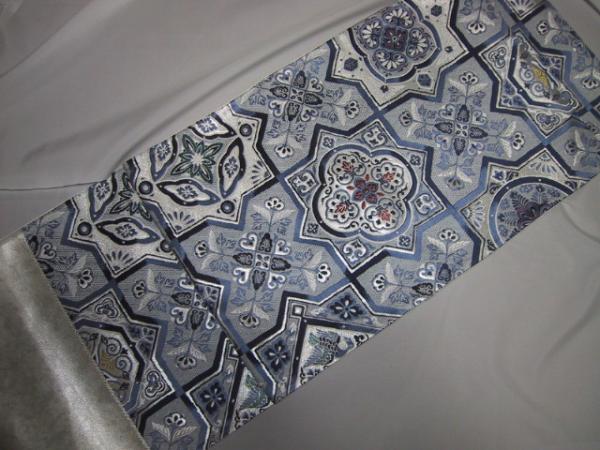 柄は4段の繰り返しです。ジグザグしたワクは濃い紺+青灰で、模様に使ってあるいろは、濃い紺、青灰、薄灰、緑系、金茶、レンガ、白系、銀いろです