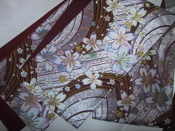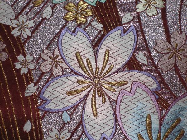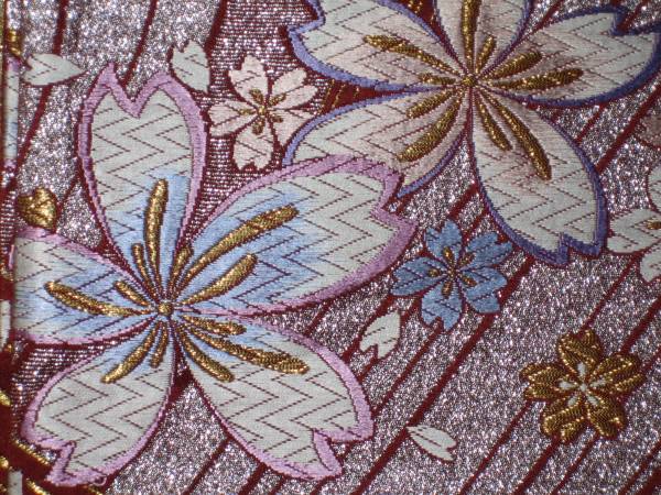なお、帯柄左上に無地で出ているところは裏無地で、柄と柄の間に出ているところは手先と前太鼓のあいだの無地部分です。六通柄です。金銀糸が多用されているためストロボの照りで、しろぽく写っている部分があります。