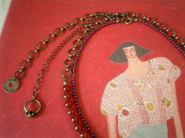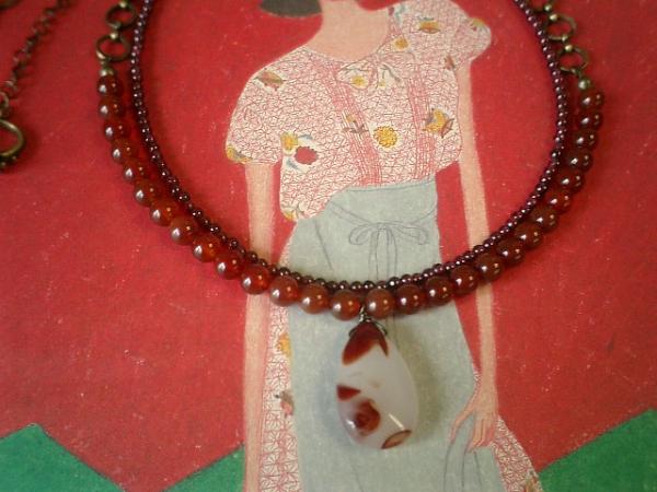 シックなガーネットと深い赤の赤メノウのネックレス、2本セットです♪お揃いで着けて頂きたいのでセットにしました。別々にも着けて頂けます。ガーネットは繊細な3ミリの丸玉です。シンプルなデザインで合わせやすいです。長さは36センチ+アジャスター14センチで最長50センチ位です。シックな赤メノウは6ミリの丸玉でトップは個性的な模様の22×15ミリ位の縞瑪瑙です。キュートな大き目のチェーンをあわせました。長さは全長54センチ位で調節自由です。お揃いのブレスレットも出品予定です♪シンプルで飽きのこないいつまでも着けられるデザインを考えて作りました!ハンドメイドをご理解頂いてノークレーム、ノーリターンでお願いします 。