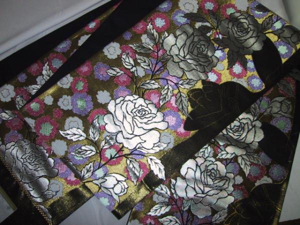 京都西陣 じゅらく の 若向きよう(振袖、訪問着、付け下げ、無地、小紋、など向き)のTOPブランド品『花かるた(花かおり)』ブランドです。6通柄袋帯 新品未仕立て品、絹100%金属糸等使用 くろ色の金の生地に銀のバラ バラと妖精、、、 柄はしに大きな妖精の右半身があります