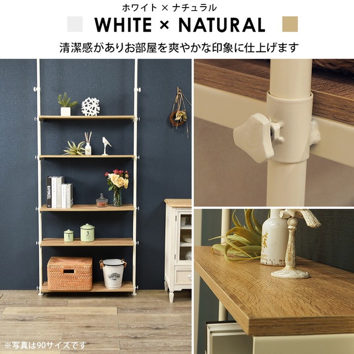 高さ無段階調整可能な木目調の棚でスッキリ収納できる、つっぱり5段ラック。