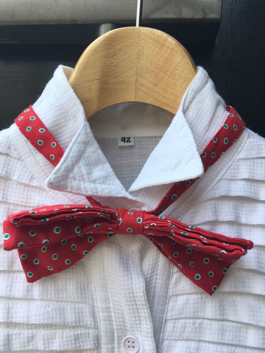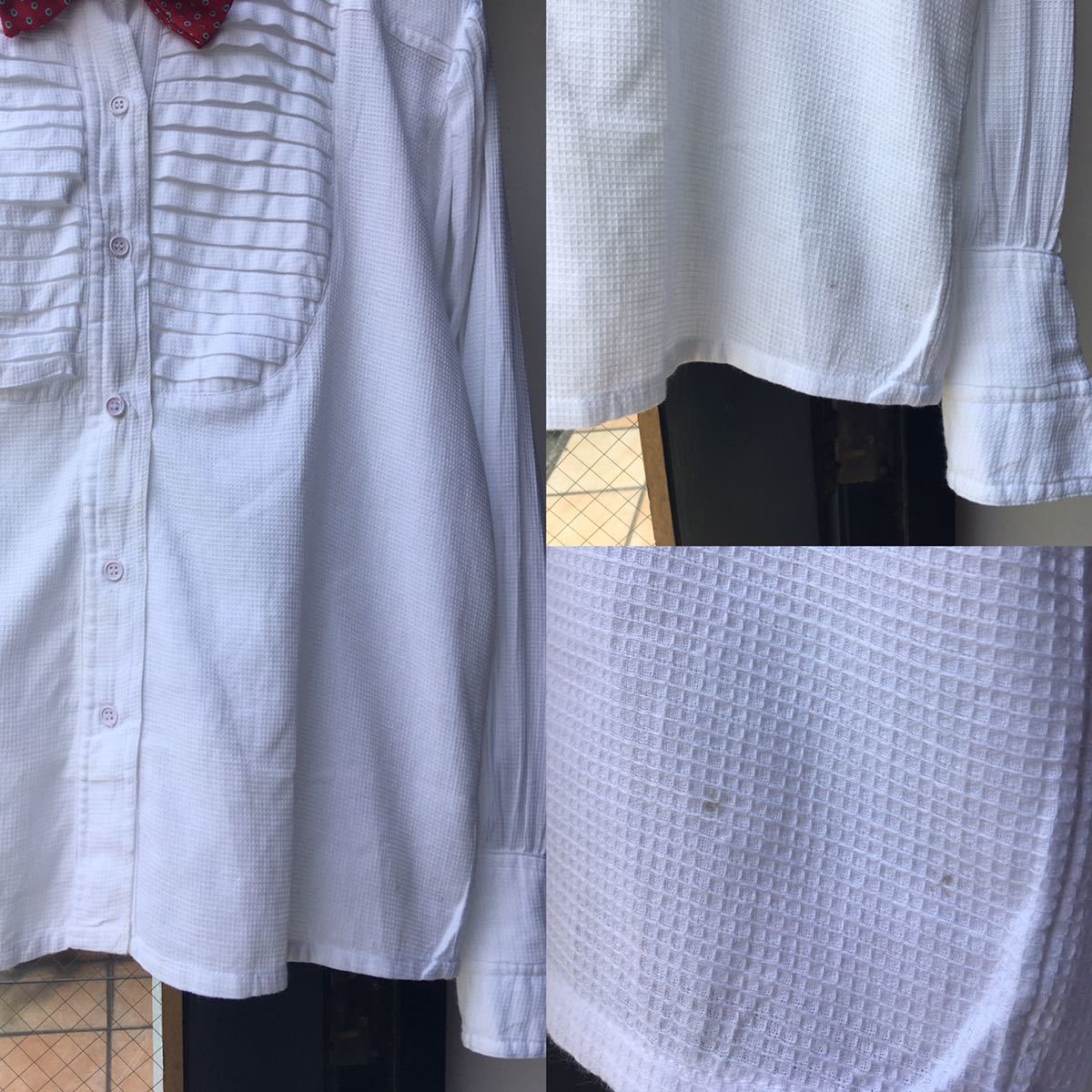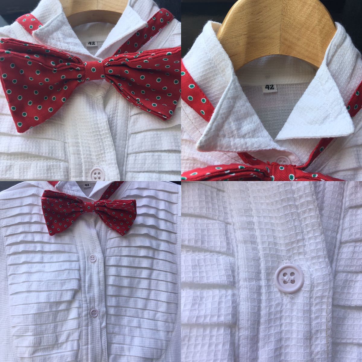 ボウタイ付きブラウスです。ボウタイは取り外し可能です。全体的に使用感ございます。フロント左下と後面に汚れがございます。写真にてご確認ください。ボウタイを取っても可愛いです!