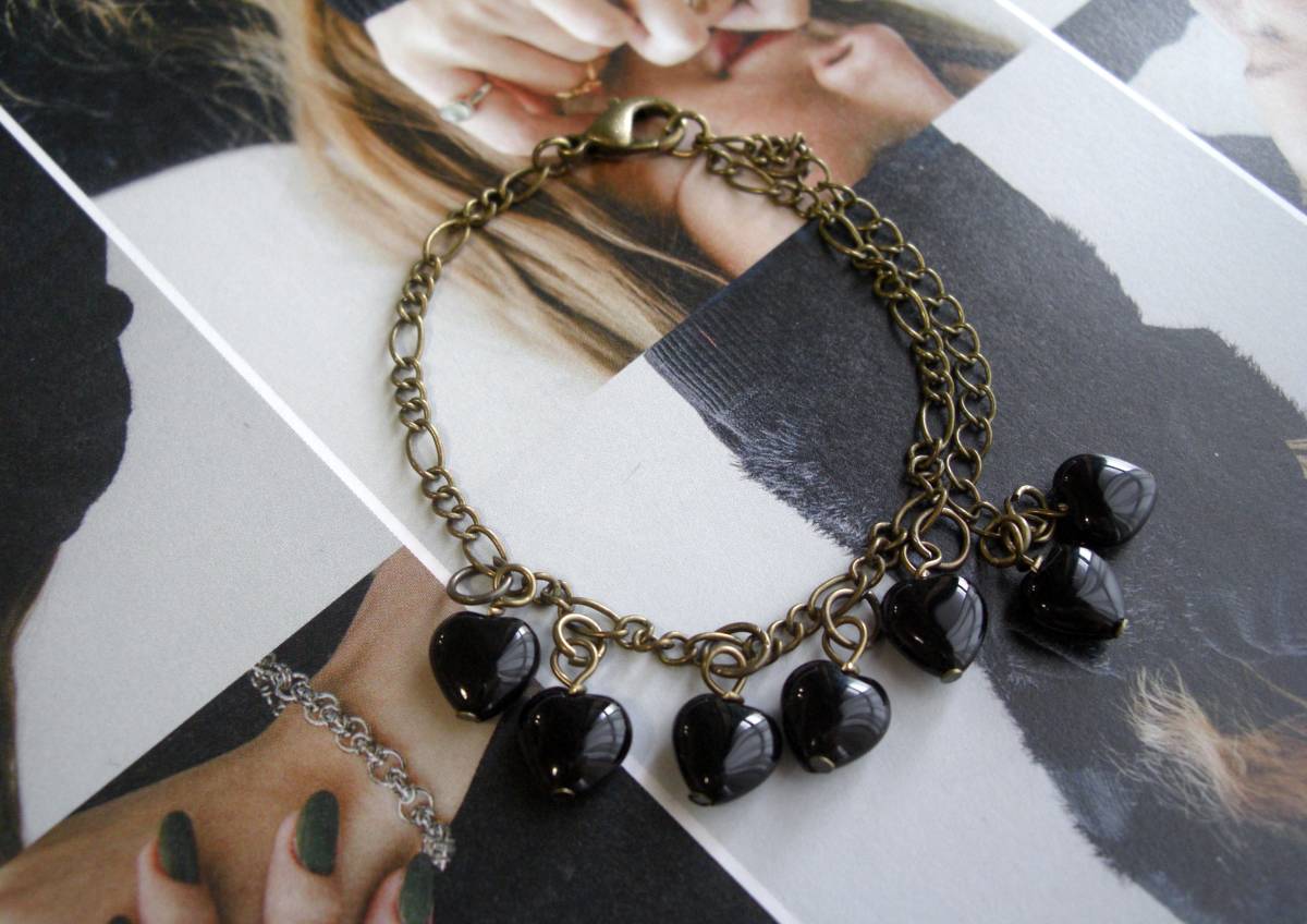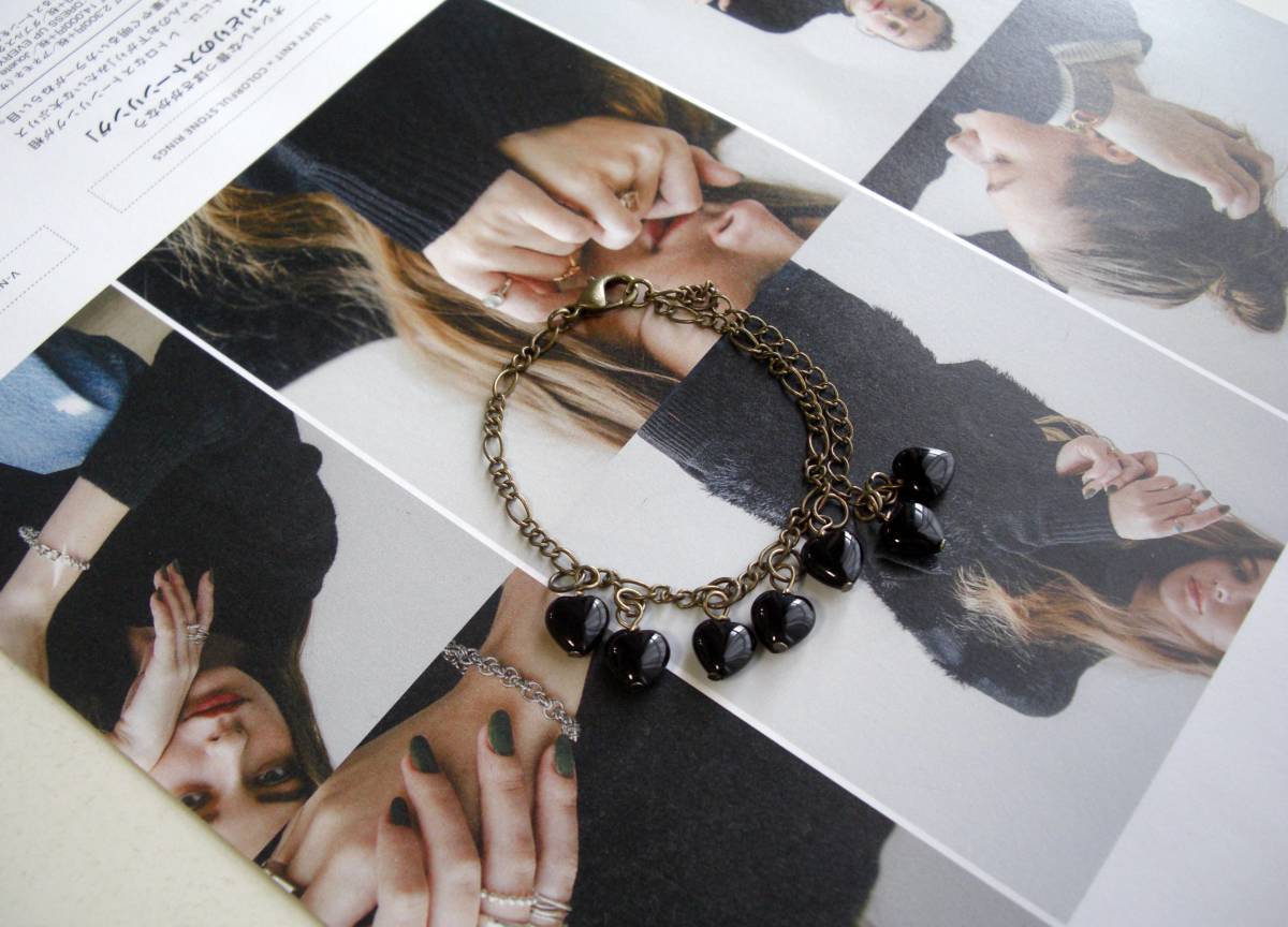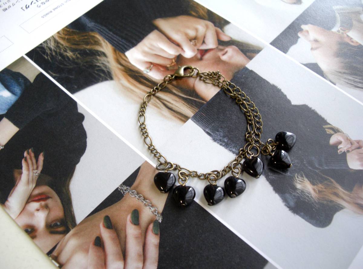 大人色・コレクション・・シリーズです♪定番のオニキス・・シックな漆黒のオニキスのブレスレットです♪小粒のハートのオニキスを繋いでキュートな表情です ♪8ミリのハートのオニキスにデザインチェーンを合わせました♪長さは23センチ位で調節自由です♪お揃いのネックレスも出品しています♪ハンドメイド をご理解頂いてノークレーム、ノーリターンでお願いします