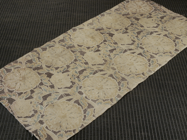 黒茶色の地に、唐花草の文様が染められている、綿の堺更紗のはぎれです。 明治期ごろにつくられたと思われるアンティークのお品です。ざらりとした古手の糸味に趣が強く感じられます。 全体的に褪色しているほか、下端から約 19cm の左耳直近に直径約 2cm のカギ裂きが 1 か所、上端から約 8cm の中央右に直径約 1mm の小穴が 1 か所ありますが、そのほかに目につく大きなしみやよごれ、褪色などのダメージはなく、この時代のものとしてはきれいな状態です。生地の力はあります。※風楽の出品内で配置違いの柄の異なる共布を出品している場合もあります。 |