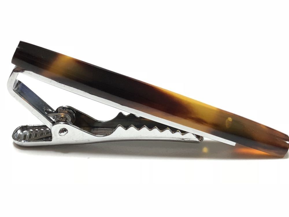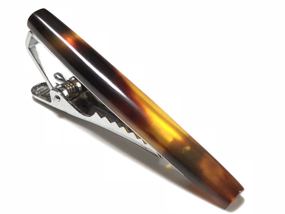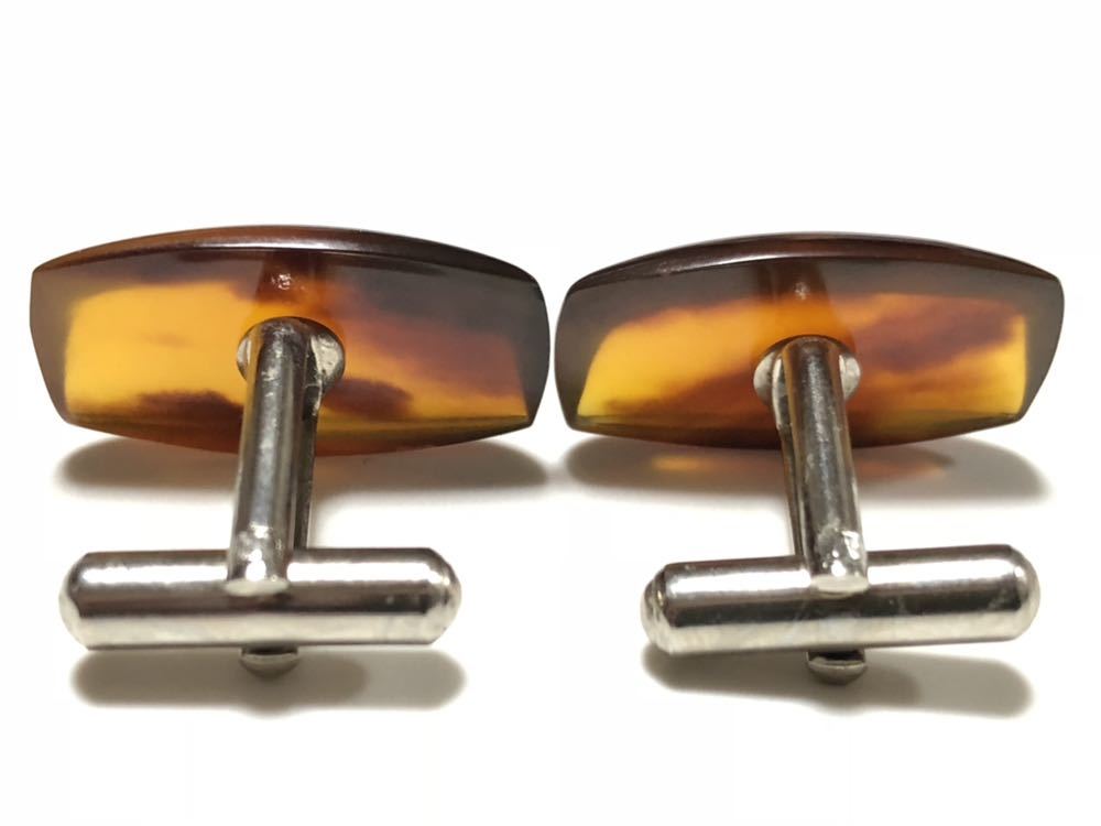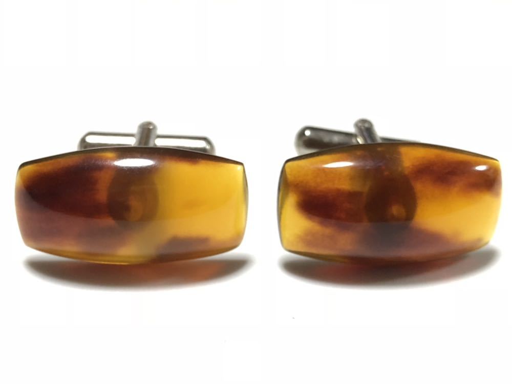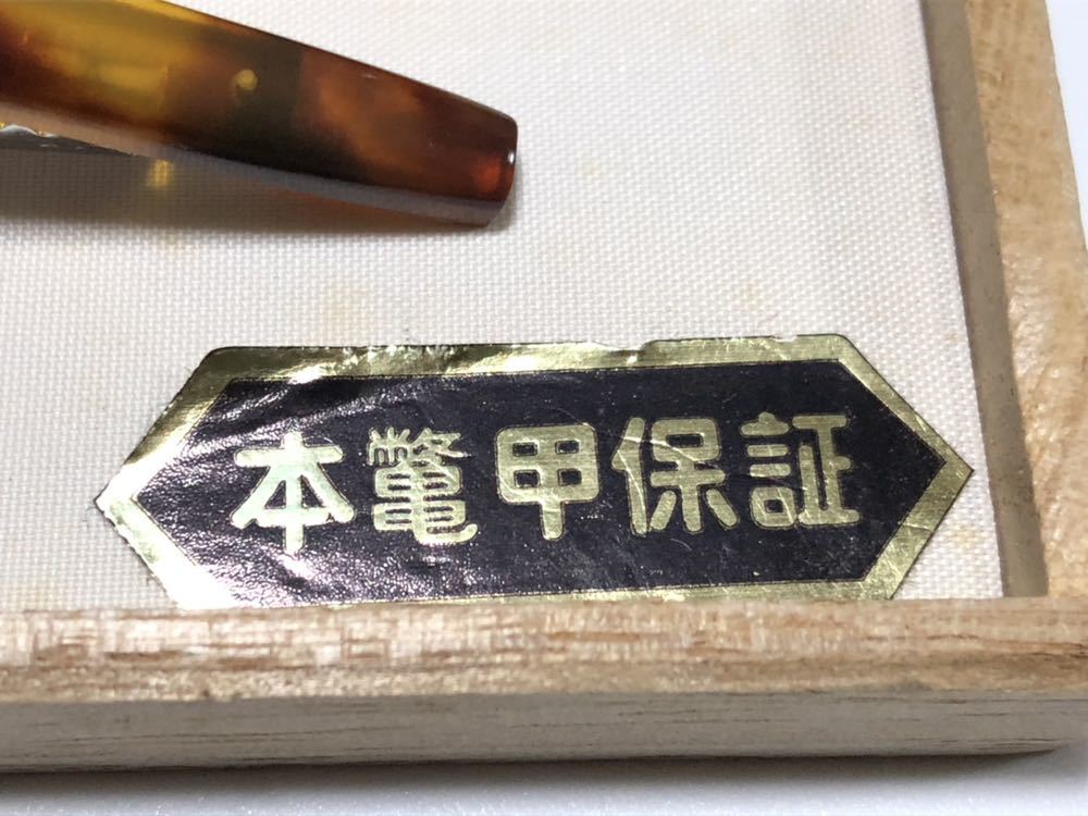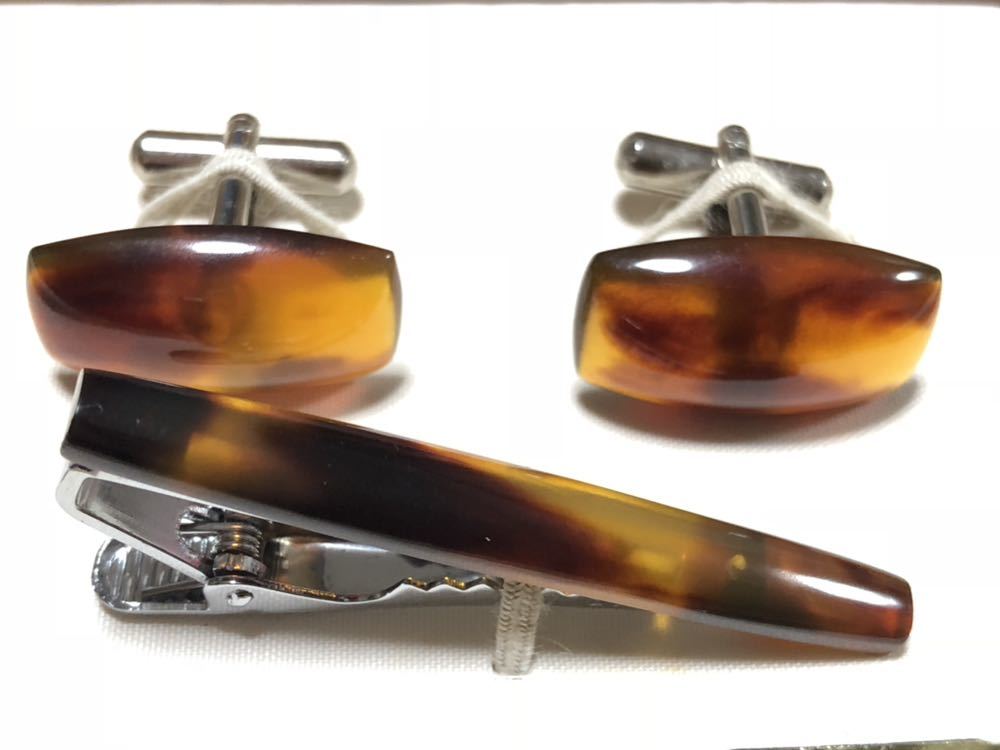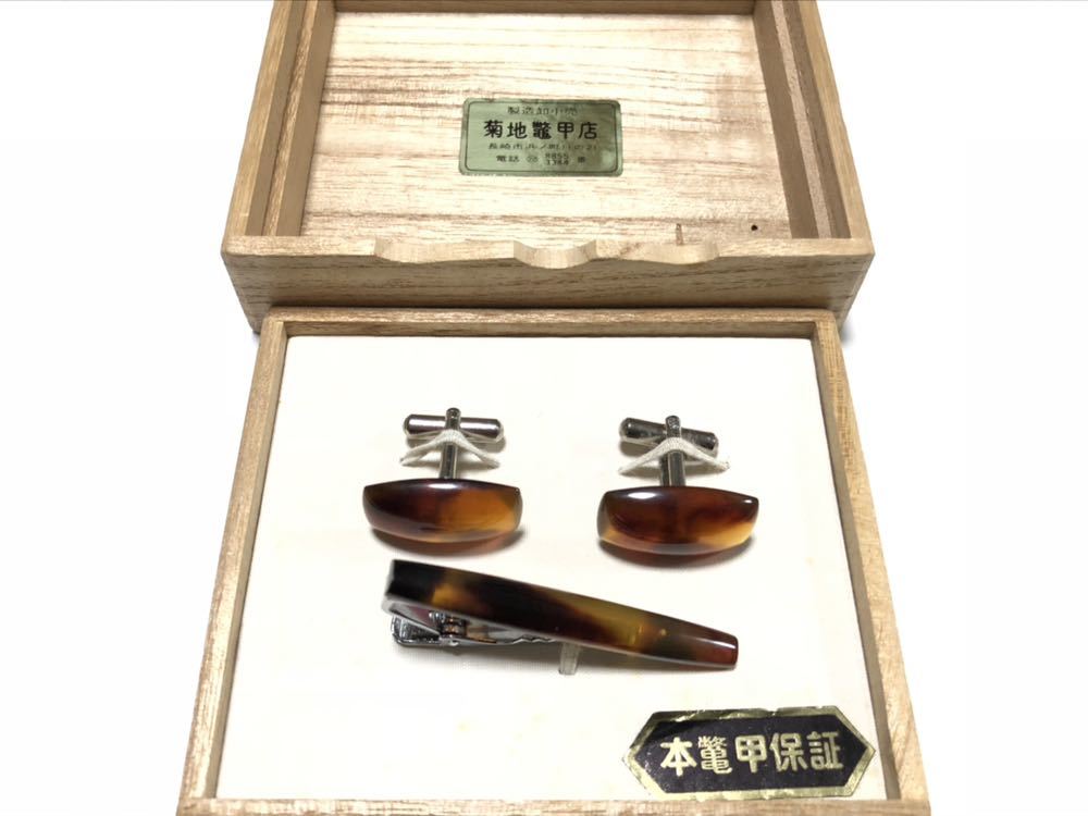 菊地鼈甲店の本鼈甲を使用した、タイピン&カフスです。鼈甲部分に欠けや虫食いは無く、状態良好です。共箱付属です。