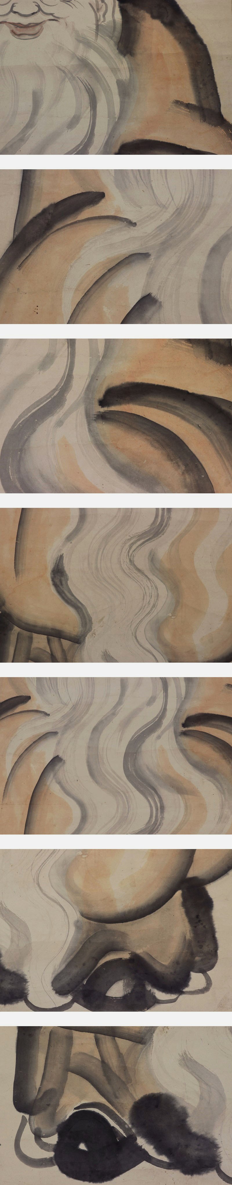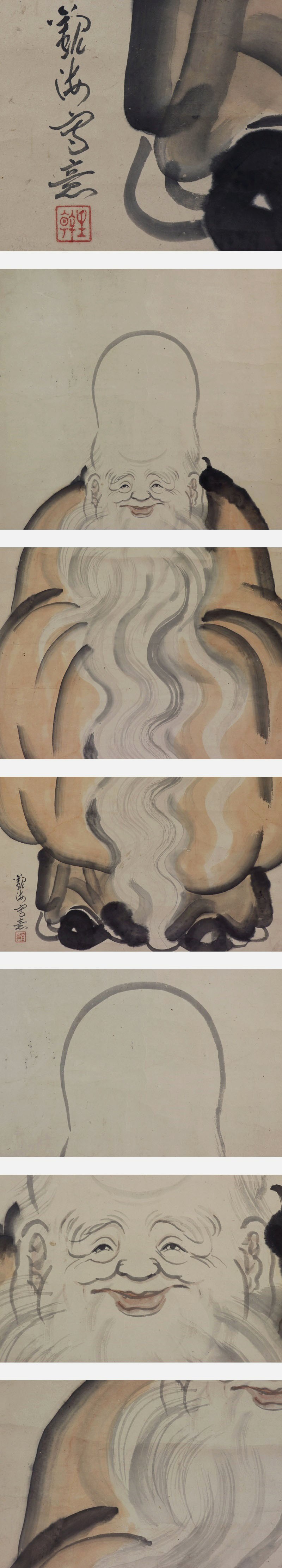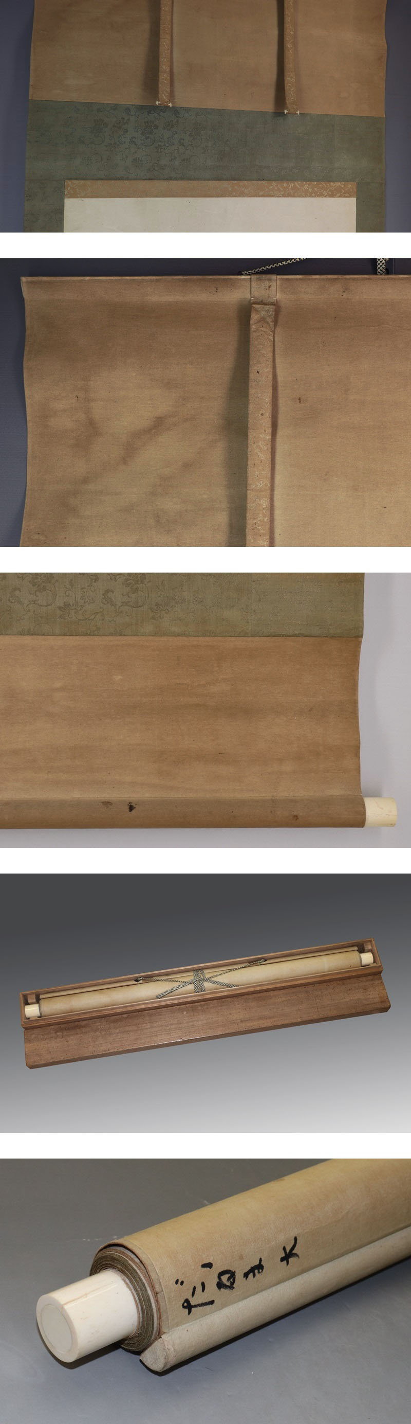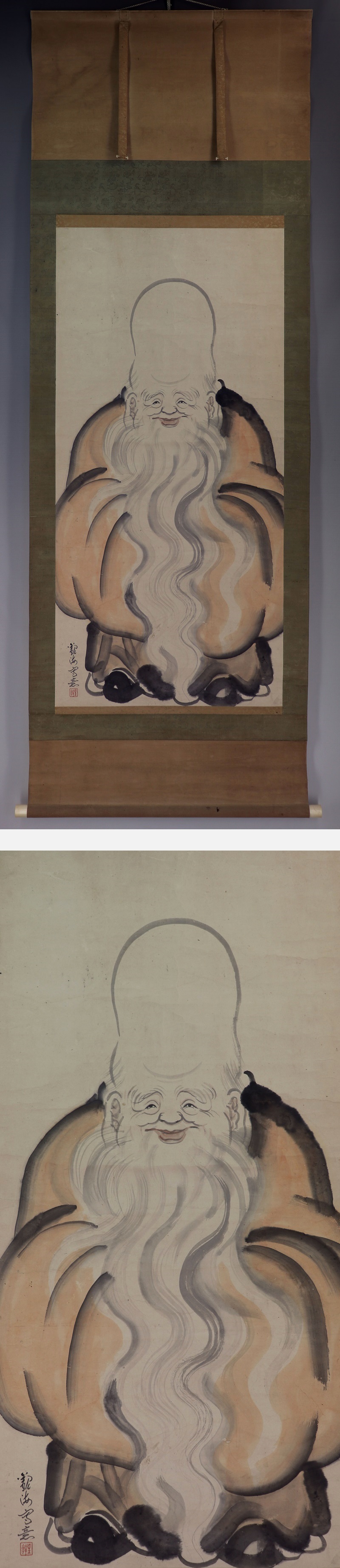 槙戸観海【大幅・福禄寿】 本紙は、染み、汚れ、強い折れ、皺、虫食があります。 表装は、染み、汚れ、折れ、皺、くすみ、ヤケ、破れ、軸先に汚れと傷みがあります。 【サイズ】 作品 横約57.5cm×縦約120.5cm 表装 横約70.5cm×縦約202.5cm |