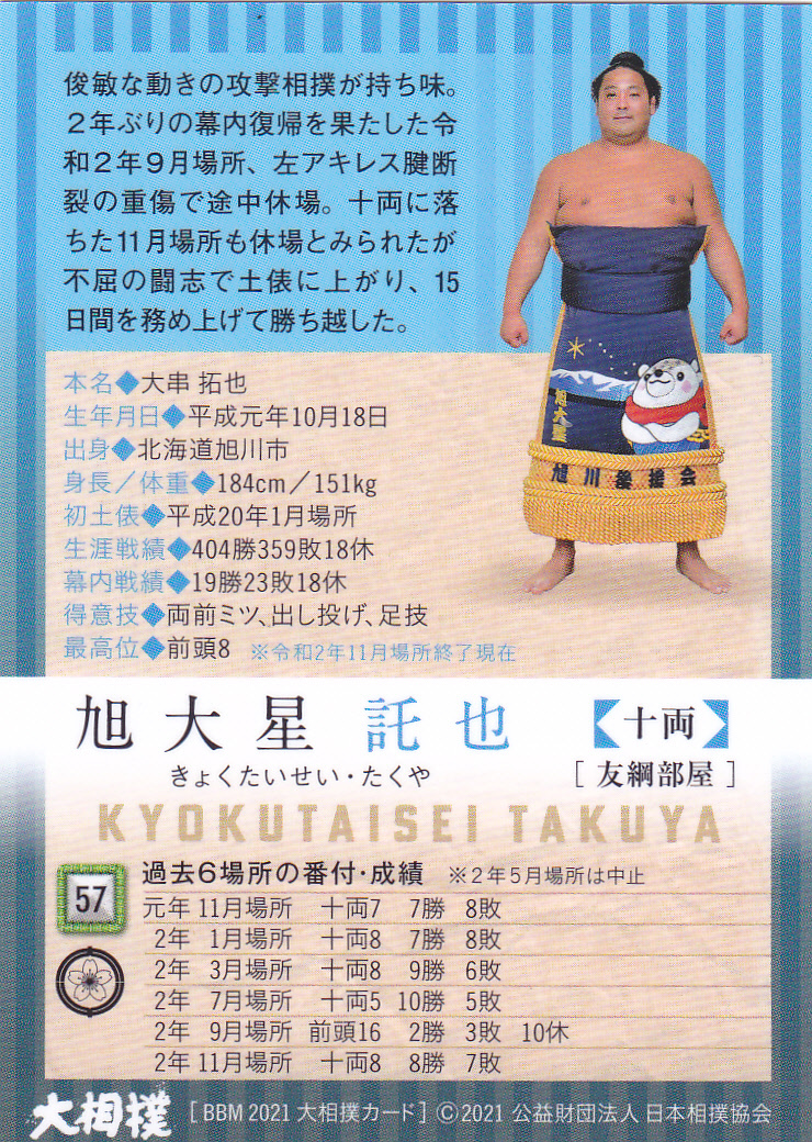 BBM2021大相撲カード 57 旭大星 友綱部屋 十両 北海道旭川市
