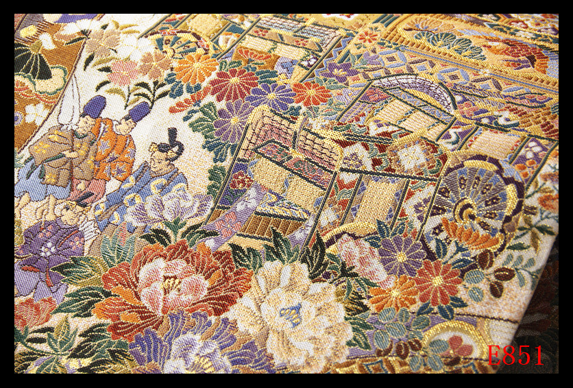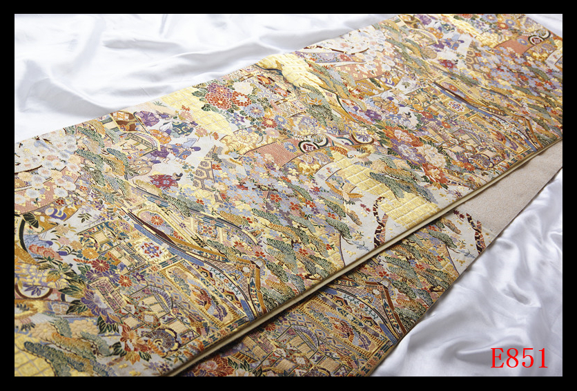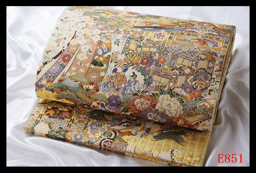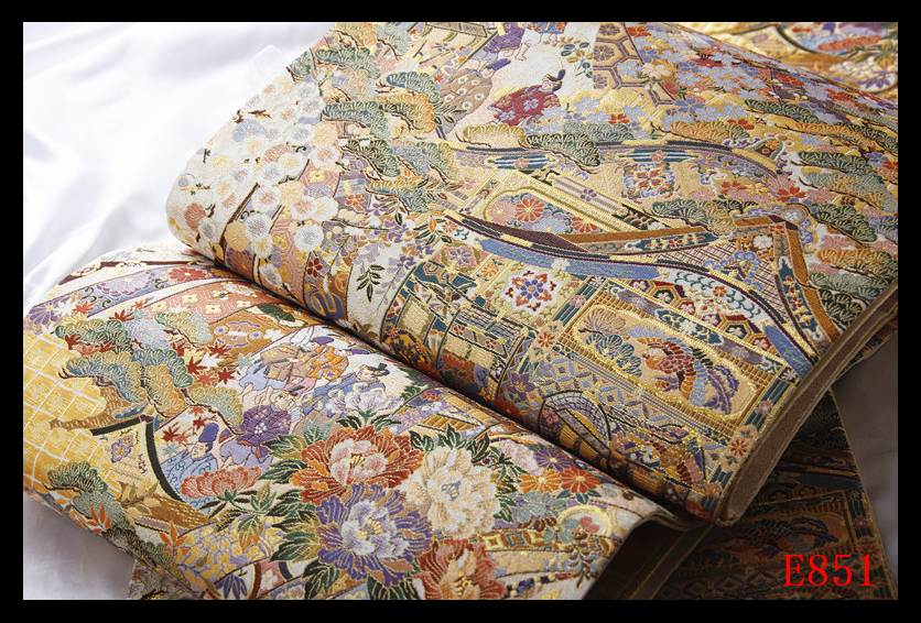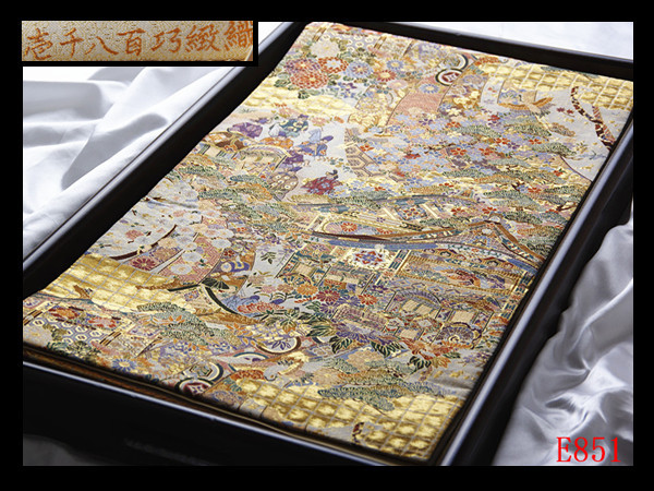 西陣織の柄組織の中では最も優れているといわれる美しい壱阡八百織の帯。現在では色糸を多く使いコストもかかる為、一部のメーカーのみで織られております。非常に緻密で絵巻文様が華やか且つ豪華に織り上げられております。名匠の本領を遺憾なく発揮して織り上げられた帯は、どのような場面でも見劣りせず気品良い着こなしを演出いたします。
