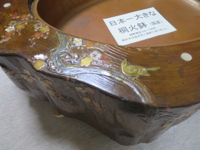 「蒔絵と象嵌火鉢E-93」 この商品はお引き取り限定です。お間違いの無き様、お願いいたします。 蒔絵と貝象嵌がびっしり有る大変存在感の有る桐材火鉢です。 分厚い雲形切のガラスがセットされテーブル仕様となっています。 中には装飾する事が可能です。 全体サイズ直径120cm×100cm 高さ27.5cm ガラスサイズ直径125cm×102cm 厚み8mm 樹齢は130~150年との事です。 この商品はお引き取り限定です。 入札前には連絡頂けると助かります。 |