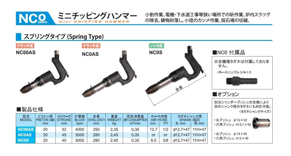 【商品詳細】 【中谷機械 ミニチッピングハンマー NC0S 】 ピストン径: 20mm ストローク: 45mm 打撃数: 3000bpm 全長 ・ 重量: 280mm ・ 2.45kg 空気消費量: 0.35m3/min ホース内径: 9.5 ・ 3/8 タガネシャンク径: Φ12.7×47 ・ 11H×47 ミニチッピングハンマーは、小割作業、電機・下水道工事等、狭い場所での斫作業や 炉内スラッグの除去、鋳物砂落し、小径のカシメ作業、採石場の 切破などに適しています。 ご注意 ※全機種タガネは付属しておりません。 ※北海道、沖縄、離島等、別途送料が発生する場合がございます。 ※お急ぎの場合は、事前に在庫確認をお願い致します。 |