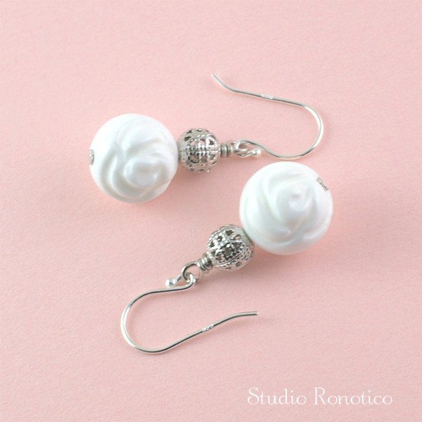 真っ白なホワイトシェルに薔薇彫刻が施された上品なデザイン 約12mmのホワイトパールボールの薔薇彫刻です。