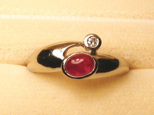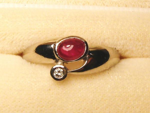 プラチナ枠にトロンとした大粒カボッションカットルビーが輝いています。