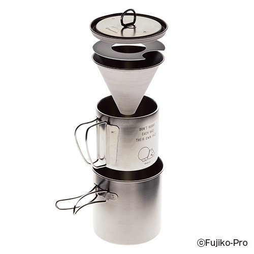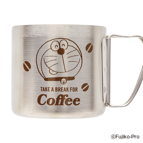 チタンのコーヒードリッパーとクッカーのセット。マグカップの両面にドラえもんをコーヒー色で特別にプリント。