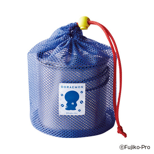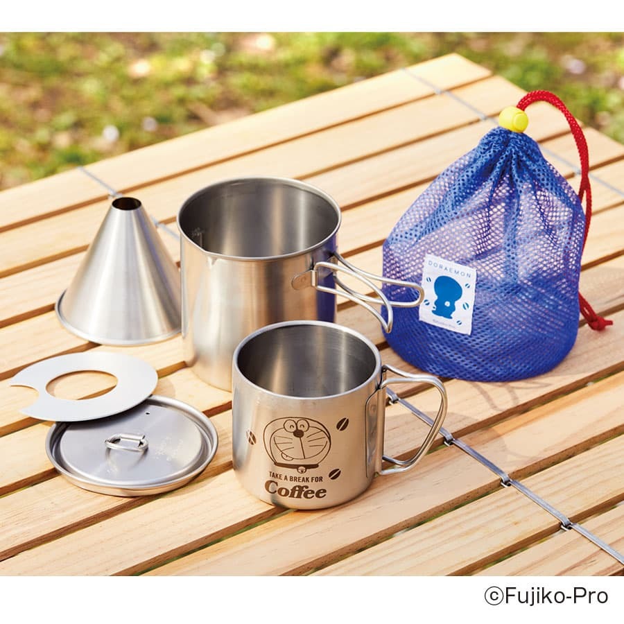 ドラえもんカラーの収納袋も限定で製作、野外で気軽にコーヒーを楽しめる。