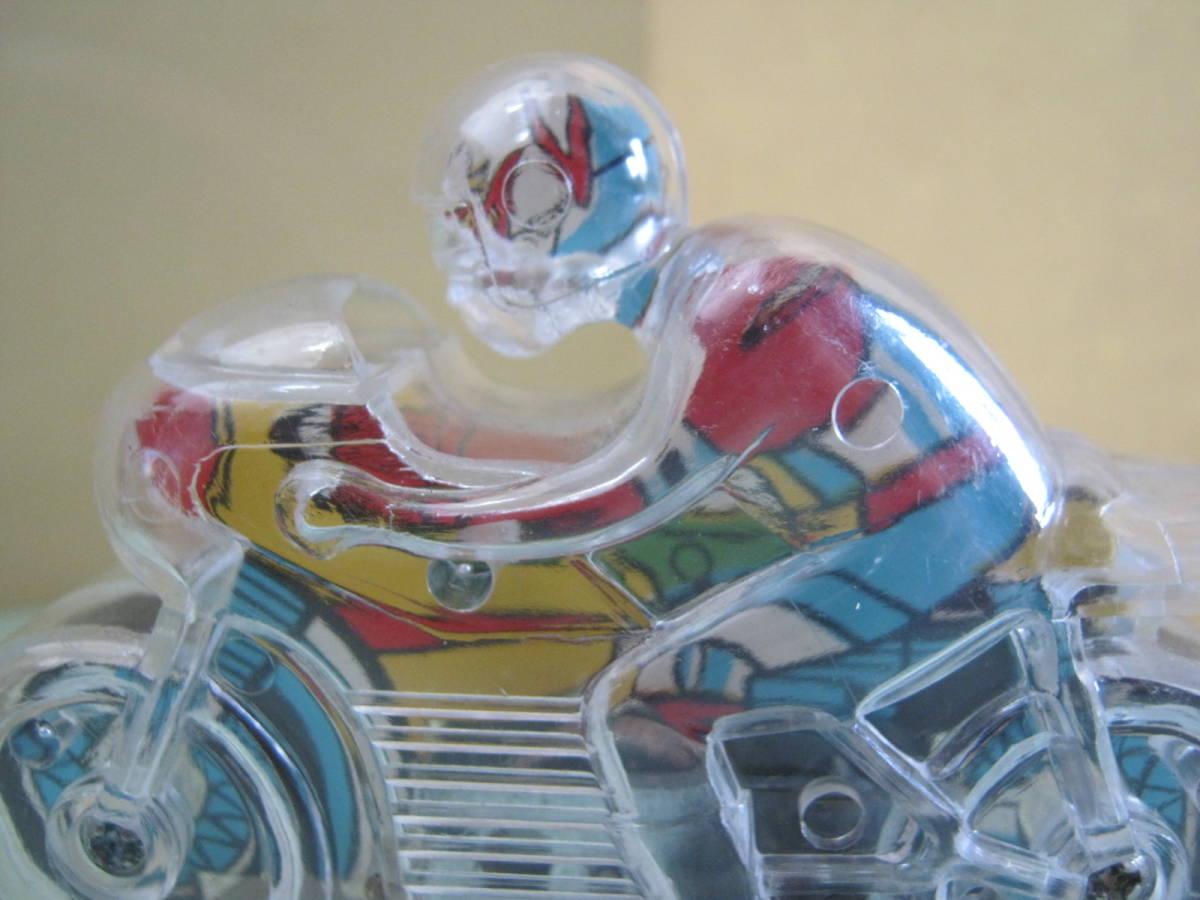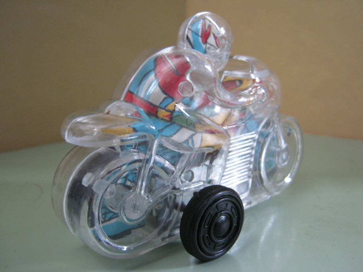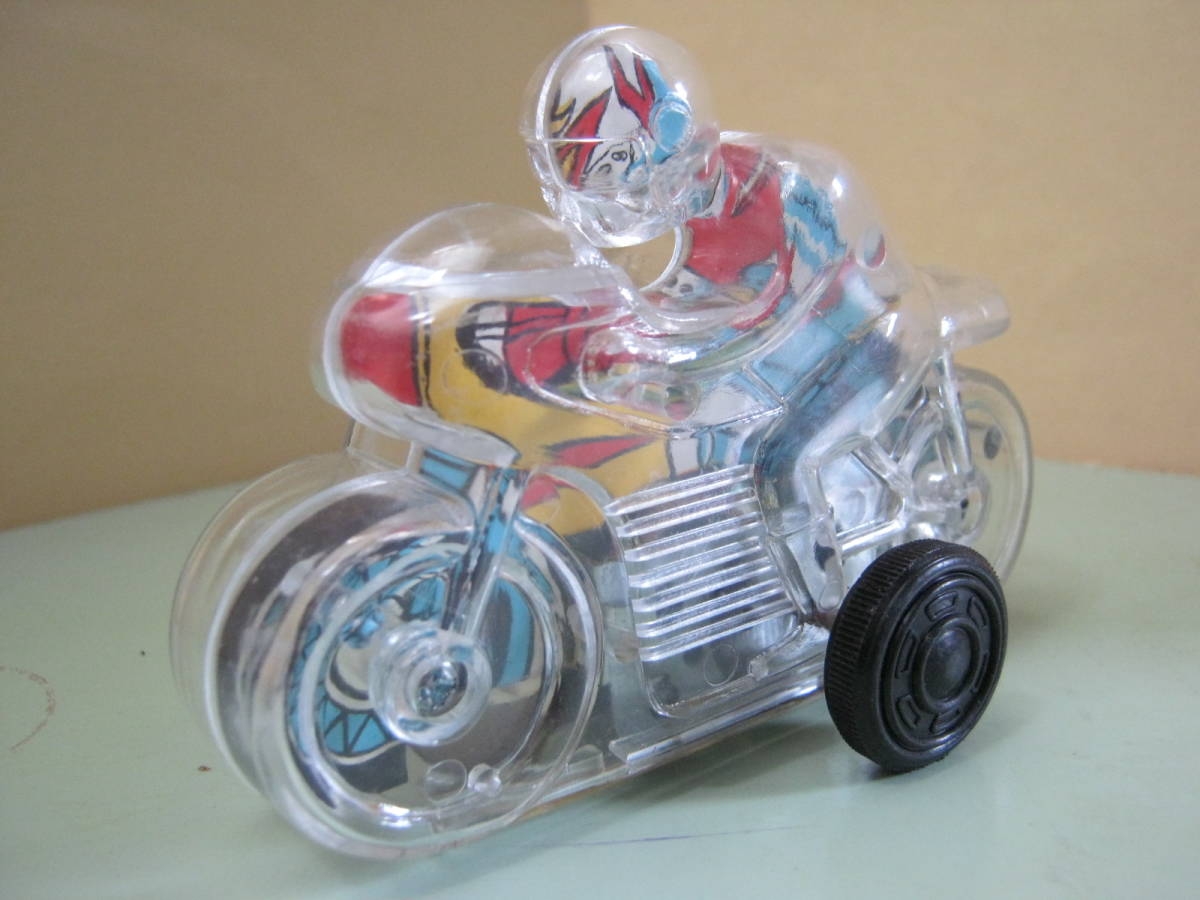 当時物です。版権付き、未使用品です。本体に汚れ、傷があります。ワレ、破損はありません。ボックス(箱)売りの為 専用の袋、箱はありません。ボックス(箱)〔12入り〕には版権付き(丸の中にCの文字タツノコプロの印字・版権シール貼ってある。)ですが個々の本体にはメーカー名、版権のシール、刻印はありません。10枚目の写真に参考にボックス(箱)の写真を載せておきます。写真のボックス(箱)は付属しませんのであくまでも本体のみです。本体サイズは約7㎝×9.7㎝×5㎝位です。フリクション・発火付きです。走らせるとバイクの下の部分から火花が見えます。可動品です。