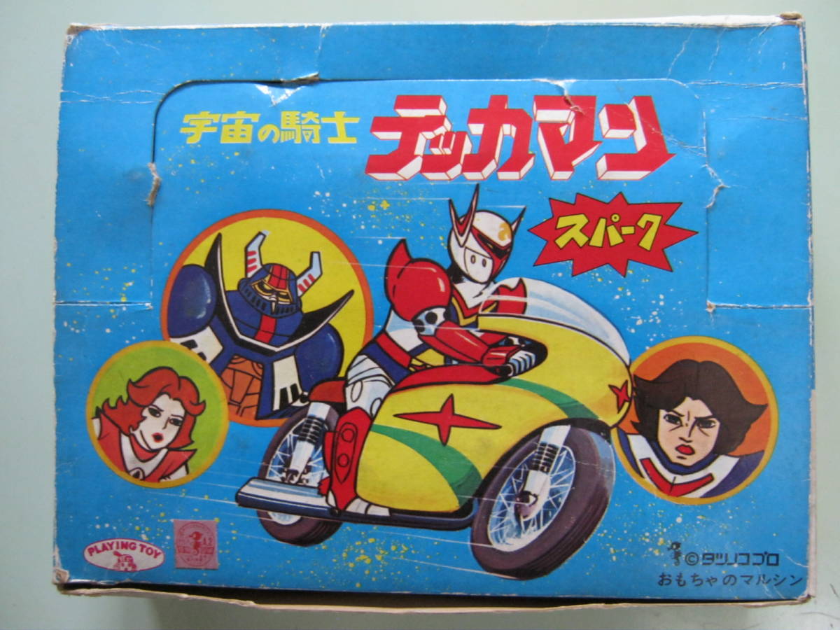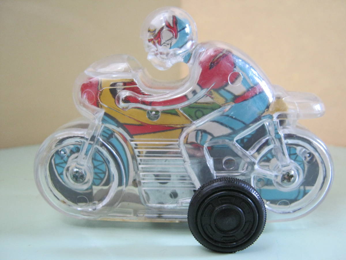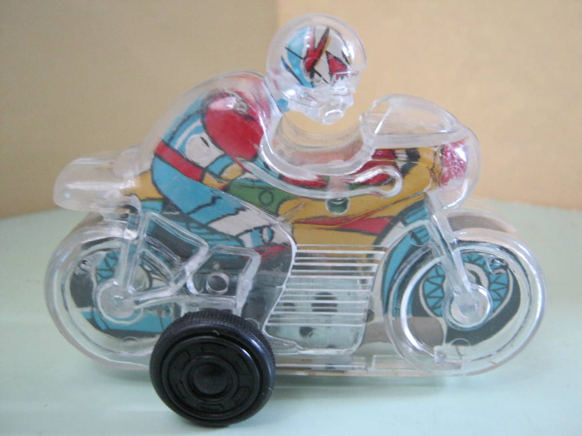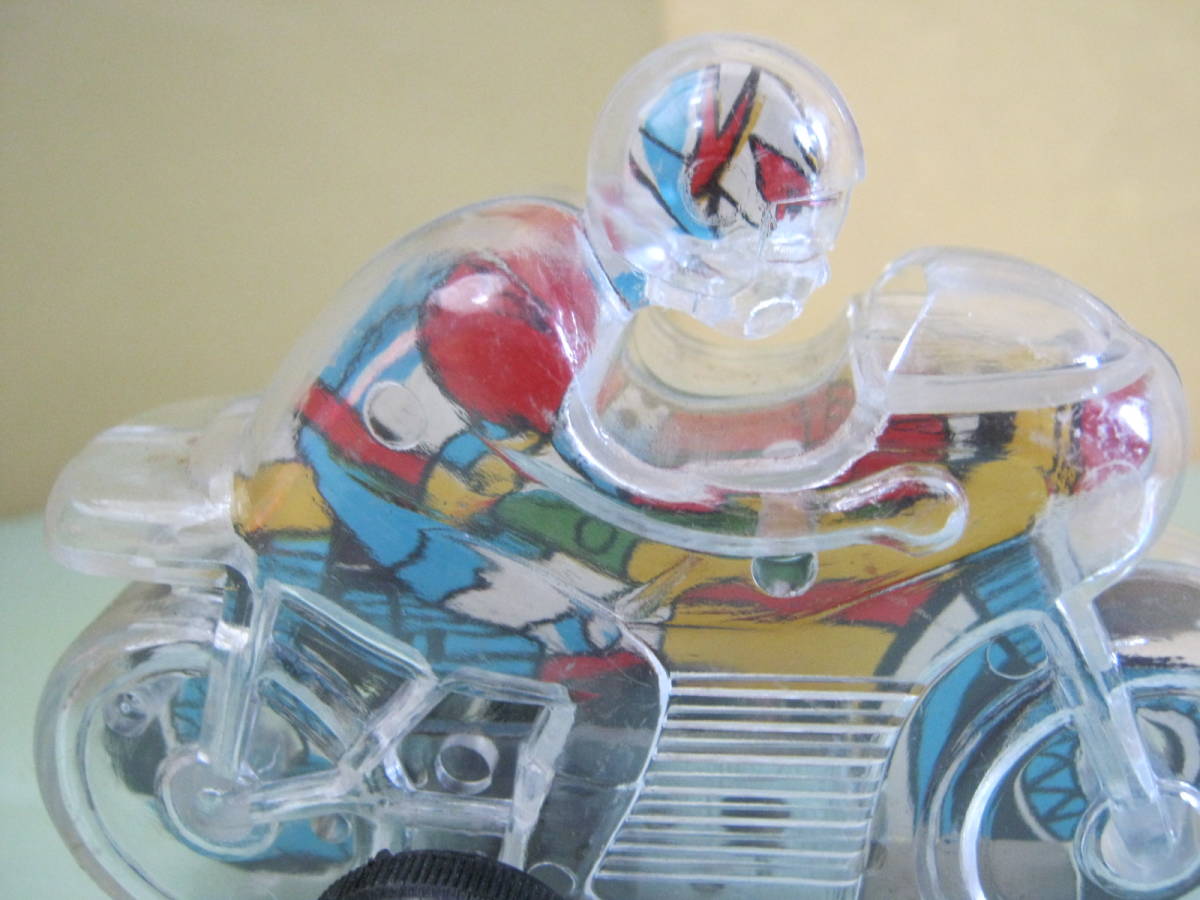 当時物です。版権付き、未使用品です。本体に汚れ、傷があります。ワレ、破損はありません。ボックス(箱)売りの為 専用の袋、箱はありません。ボックス(箱)〔12入り〕には版権付き(丸の中にCの文字タツノコプロの印字・版権シール貼ってある。)ですが個々の本体にはメーカー名、版権のシール、刻印はありません。10枚目の写真に参考にボックス(箱)の写真を載せておきます。写真のボックス(箱)は付属しませんのであくまでも本体のみです。本体サイズは約7㎝×9.7㎝×5㎝位です。フリクション・発火付きです。走らせるとバイクの下の部分から火花が見えます。可動品です。